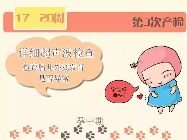 | | 17-20周 | 第3次产检 详细超音波检查 可看出胎儿性别 首次胎动 | 孕20周做超声波检查,主要是看胎儿外观发育上是否有较大的问题。医师会仔细量胎儿的头围、腹围、看大腿骨长度及检视脊柱是否有先天性异常。准妈妈在16周时,已可看出胎儿性别,但在20周时,准确率更高。至于最令准妈妈期待的首次胎动,约在18-20周出现。 | | 21-24周 | 第4次产检