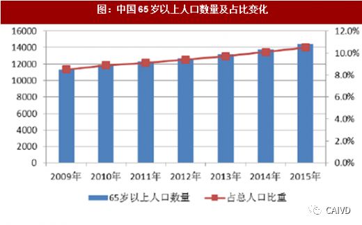 图:中国城镇医保支出及其变化(万元) (5)人口老龄化的趋势 根据联合国标准,一个地区 60 岁以上人口占到总人口的10%,或者是65岁以上人口占到总人口的7%,该地区就进入了老龄化社会。我国21 世纪初就已经进入老龄化社会,目前65 岁及以上人口稳步增长,已达到1.38 亿人,占总人口比重约为10%,未来中国老龄化率将继续提高,老龄人口数量保持增长态势。