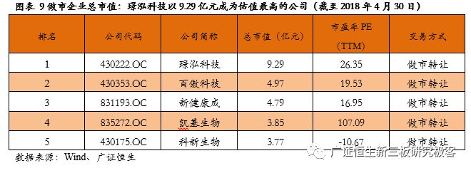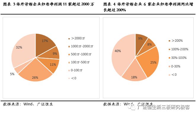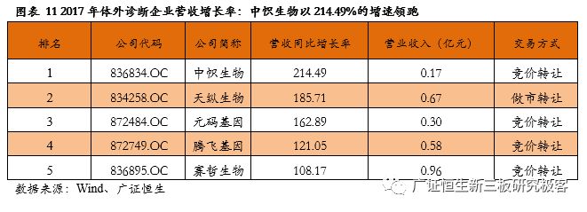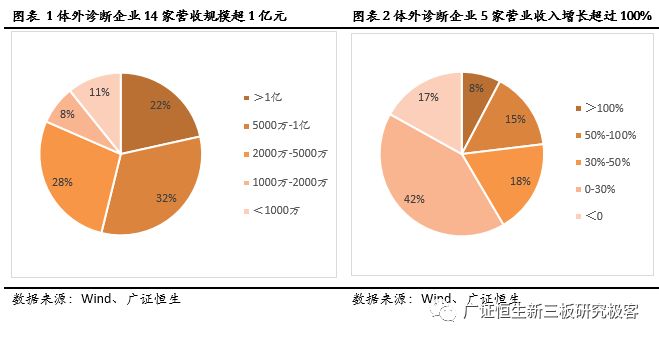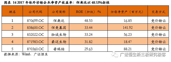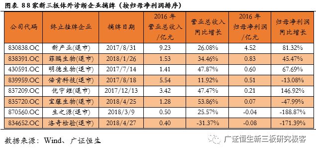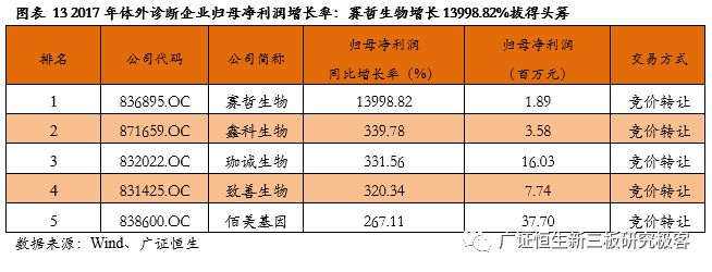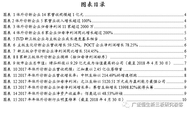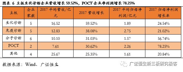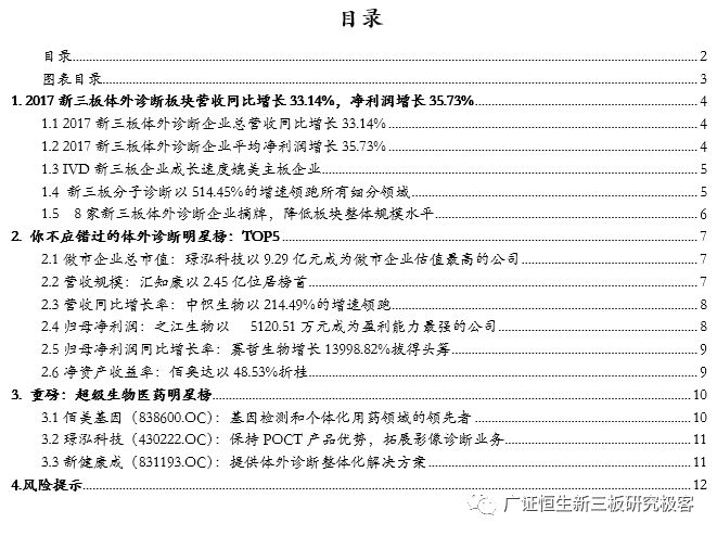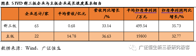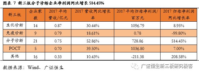 【风险提示】 政策变化的风险;技术发展低于预期风险。 目前新三板各公司2017年度报告已基本披露完毕。截至4月30日,新三板挂牌企业共11382家,主营业务为医药生物相关的企业计654家。作为医药领域的重要细分,体外诊断企业表现抢眼,我们在此文中对该领域的新三板企业做单独的剖析,依据65家体外诊断企业已披露的2017年年报,广证恒生按照总市值、营业收入及同比增长率、归母净利润及同比增长率、净资产收益率(ROE)指标进行排名,选出明星企业前五强。 1. 2017新三板体外诊断板块营收同比增长33.14%,净利润增长35.73% 1.1 2017新三板体外诊断企业总营收同比增长33.14% 已披露2017年报的65家体外诊断企业总计营收43.90亿元,平均营业收入6753.49万元,同比增长33.14%,其中14家企业营收规模超1亿元,5家企业营业收入同比增长100%。 1.2 2017新三板体外诊断企业平均净利润增长35.73% 已披露2017年报的65家体外诊断企业总计归母净利润3.25亿元,平均归母净利润499.54万元,同比增长35.73%,平均净利率7.40%。其中11家企业归母净利润超2000万元,6家企业归母净利润同比增长200%。 1.3 IVD新三板企业成长速度媲美主板企业 我们把新三板的体外诊断企业与包括达安基因、安图生物、科华生物等在内的22家主板体外诊断企业做一些比较,从规模来看,新三板企业营业收入及归母净利润均显著小于主板企业;但是,从增长速度来看,新三板企业的营业收入与归母净利润相对于2016年增速与主板企业基本相当。 1.4 新三板分子诊断以514.45%的增速领跑所有细分领域 分析主板体外诊断企业在2017年的表现,我们发现生化诊断的5家企业营业收入增长最快,达到59.52%,远高于我国生化诊断行业的7%的年均增速,而净利润增长速度仅为24.54%,说明生化诊断行业的集中度较高,国产替代的速度逐渐加快,但是行业竞争激烈,成本压力较大,毛利率下降导至利润率较低。 同样地,POCT领域归母净利润增长达到78.25%,是增长最快的细分领域,其增长率也远高于我国POCT行业20%的年均增速,说明POCT行业的集中度较高。 而新三板的体外诊断企业中,21家分子诊断领域企业业绩表现最为亮眼,营业收入增长52.86%,而归母净利润达到514.45%,说明随着“精准诊断”、“精准治疗”的理念逐渐深入人心,巨大的需求将推动分子诊断产业持续快速增长。 新三板5家POCT企业营收增速较快,达39.50%,但其净利润增速却不尽如人意,仅为7.00%,远低于国内POCT行业的增速,可能是由于国内POCT领域行业竞争开始加大,毛利率下降所致。 新三板9家免疫诊断企业营业收入同比增长18.61%,归母净利润却下降99.80%,与我国免疫诊断行业20%的年均增速相悖,这是由于新三板的免疫诊断企业多经营酶联免疫(ELISA)产品,该类产品已逐渐被快速发展的化学发光产品所替代,导至新三板免疫诊断企业降价压力增大、盈利空间被压缩。 1.5 8家新三板体外诊断企业摘牌,降低板块整体规模水平 自2017年5月至2018年5月共有8家企业陆续摘牌,其中不乏有各细分领域的龙头企业,如新产业、明德生物、菲鹏生物等,部分企业摘牌后已成功登陆A股。从整体业绩情况来看,这8家摘牌企业最新报告期中平均营收及平均归母净利润分别为2.91亿、8272万,远高于体外诊断板块整体水平,这证明新三板已成功孵育出一批优质的体外诊断企业,同时,这些企业的摘牌也导至新三板体外诊断板块的整体规模水平有一定程度的下降。 2. 你不应错过的体外诊断明星榜:TOP5 2.1做市企业总市值:璟泓科技以9.29亿元成为做市企业估值最高的公司 由于做市企业股票价格和估值指标相对于协议企业更为公允,因此广证恒生选择做市企业总市值进行排名。做市转让市值最高的是璟泓科技(430222.OC)9.29亿元。