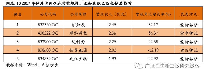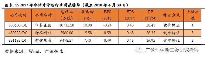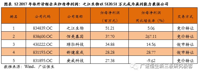 做市企业总市值排名前5的企业:璟泓科技、百傲科技、新健康成、凯基生物、科新生物。 2.2营收规模:汇知康以2.45亿位居榜首 截至4月30日,有65家体外诊断企业已披露2017年报,平均营业收入6753.49万元,其中14家企业营收规模超1亿,汇知康(832350.OC)以2.45亿元的营收规模成为体外诊断板块营收规模最大的企业。 营业收入排名前5的企业包括:汇知康、璟泓科技、达科为、佰美基因、之江生物。 2.3营收同比增长率:中帜生物以214.49%的增速领跑 在营业收入同比增长率方面(1)营收同比增长率的核心分布区域在0-30%,共计27家,约占整个体外诊断企业的41.54%;(2)营收同比增长率为负的有11家,占比16.92%;(3)营业收入同比增长率大于100%企业计5家,占比7.69%,他们是中帜生物 214.49%、天纵生物 185.71%、元码基因162.89%、腾飞基因121.05%、赛哲生物 108.17%。 2.4归母净利润:之江生物以 5120.51万元成为盈利能力最强的公司 从归母净利润区域分布看,根据2017年报可知:(1)2017年报归母净利润的核心分布区域均是100-500万;(2)2017年报归母净利润超过2000万元的有11家,约占整个体外诊断企业的16.92%。归母净利润最高的是之江生物(834839.OC)5120.51万元。 归母净利润排名前5的企业:之江生物、佰美基因、璟泓科技、新健康成、爱威科技。 2.5归母净利润同比增长率:赛哲生物增长13998.82%拔得头筹 在归母净利润同比增长率方面,(1)同比增长率的核心分布区域在30%-100%,共计16家,约占整个体外诊断企业的24.62%;(2)归母净利润同比增长率大于200%企业计6家,占比9.23%,其中增速最高的是 赛哲生物(836895.OC)13998.82%。 归母净利润增速排名前5的企业:赛哲生物、鑫科生物、珈诚生物、致善生物、佰美基因。 2.6净资产收益率:佰奥达以48.53%折桂 从盈利能力来看,2017年净资产收益率(加权)超过10%的有28家,最高的是佰奥达(870699.OC)的48.53 %。 净资产收益率排名前5的企业:佰奥达、佰美基因、珈诚生物、豪迈生物、普瑞柏。 3. 重磅:超级生物医药明星榜 本次新三板体外诊断行业明星企业大比拼主要有6个排名指标,分别是总市值、营收规模、营收规模同比增长率、归母净利润、归母净利润同比增长率、净资产收益率。广证恒生新三板研究团队对6个榜单中上榜次数为3次及3次以上的明星企业基本情况进行展示,其中3家企业上榜3次及以上,1家明星企业上榜4次。广证恒生将详细介绍上榜3次及以上的新三板超级明星企业,包括佰美基因(838600.OC)、璟泓科技(430222.OC)、新健康成(831193.OC)。 3.1佰美基因(838600.OC):基因检测和个体化用药领域的领先者 佰美基因是一家深耕基因检测领域的高新技术企业,致力于药物基因组学和个体化用药领域的技术研究、产品开发和推广,推出了重大疾病的个体化用药基因检测系列产品和个人健康遗传检测系列产品。自成立以来,公司已拥有45 项专利,其产品在药物筛选和个体化用药方面均位于国内前列。 广证恒生认为该公司有以下三个亮点: (1)在个体化用药领域拥有技术优势:个体化用药是指在考虑患者的药物代谢基因类型等因素后综合其病情设立特定的药物治疗方案,佰美基因联合多家机构共同建立了全球最大的CYP450酶功能库和注释库,为患者提供优质的个体用药检测业务,符合个体化用药信息化的趋势。 (2)大力投入个体化用药研发以丰富产品线:公司高度重视个体化用药基因检测产品的研发,建成了全面先进的技术平台和生物样本库,并将产品线从检测试剂、仪器拓展至自动化报告系统,以一体化服务推动公司业务快速发展。 (3)建立多种渠道增强销售实力:公司主要通过“直销+代理”的模式,为医疗机构、企事业单位、大众客户及司法机构提供基因组学为基础的分析和鉴定服务,目前已形成了覆盖陕西,辐射中西部地区的战略布局,为全国100多家医疗机构和科研院所提供了个体化用药服务及产品。 3.2璟泓科技(430222.OC):保持POCT产品优势,拓展影像诊断业务 璟泓科技主要致力于诊断试剂和仪器等生物类高新技术产品的研发、生产及销售,产品以免疫诊断、分子诊断为重点,涉及心脑血管疾病、癌症肿瘤、优生优育等领域的快速检测。拥有通过认证的10万级GMP生产车间,具有多项世界领先水平的发明专利。 广证恒生认为该公司有以下三个亮点: (1)加大自主研发力度,保持POCT领域的技术优势:公司拥有10 万级的洁净厂房及生产设备,拥有胶体金、荧光免疫层析等高新技术平台,公司业务中超过50%都集中在POCT相关产品。璟泓科技自成立起一直重视研发领域的投入,坚持自主创新,获得了国家授权专利35项,国家二、三类医疗器械注册证32项,构建了坚固的技术壁垒。 (2)销售渠道多样化提高销售竞争力:制约POCT行业公司做大的一个关键因素在于销售渠道十分分散。为了业务的持续发展,公司设立了全资子公司武汉璟泓万方堂大药房有限公司用于线下连锁销售,北京万方堂在线电子商务有限公司专门用来线上销售,做到了“经销和直销相结合”、电子商务立体营销模式,通过线上和线下为全国各大医疗机构、连锁药店等提供快速诊断产品。 (3)发展医疗影像诊断新领域:为公司整体发展战略及规划的需要,2016 年完成了对武汉凯进医疗技术有限公司60%股权的收购,公司正式涉足医疗影像诊断领域,主要产品有数字化X射线摄影系统、全彩多普勒超声诊断仪等,为公司带来了新的盈利增长点。 3.3 新健康成(831193.OC):