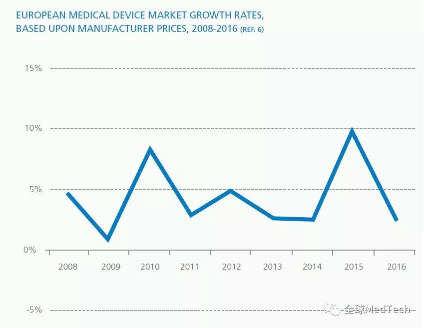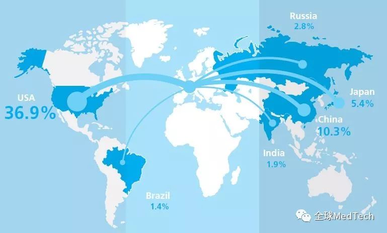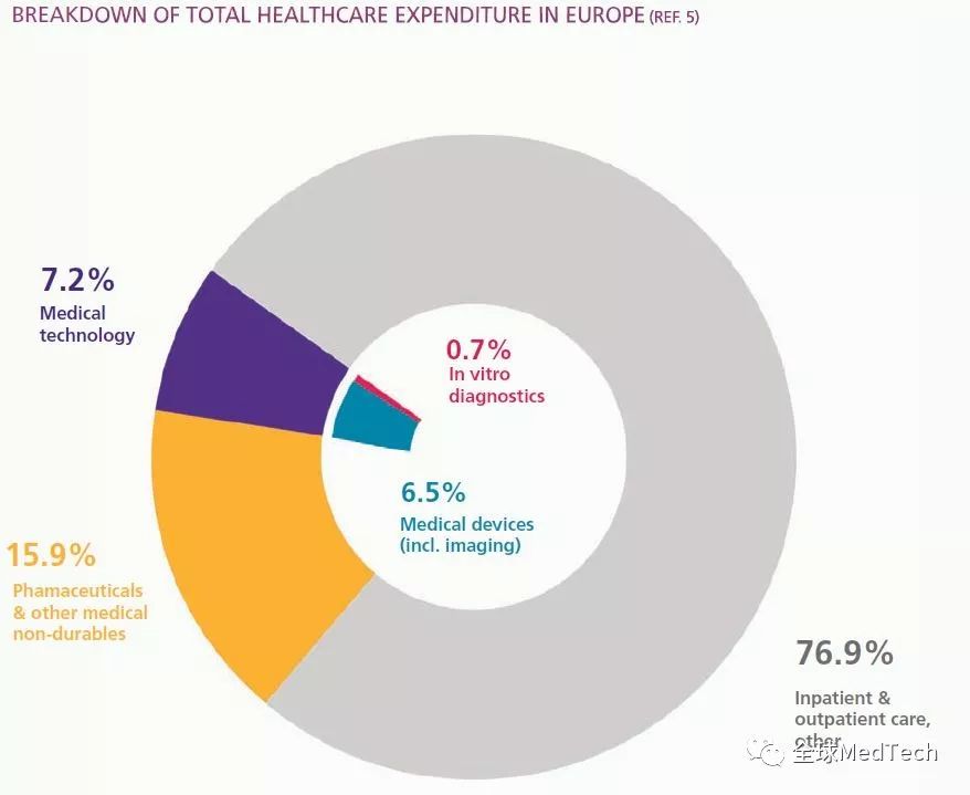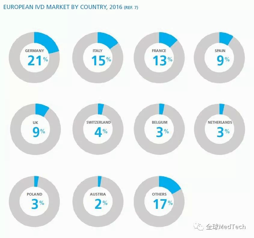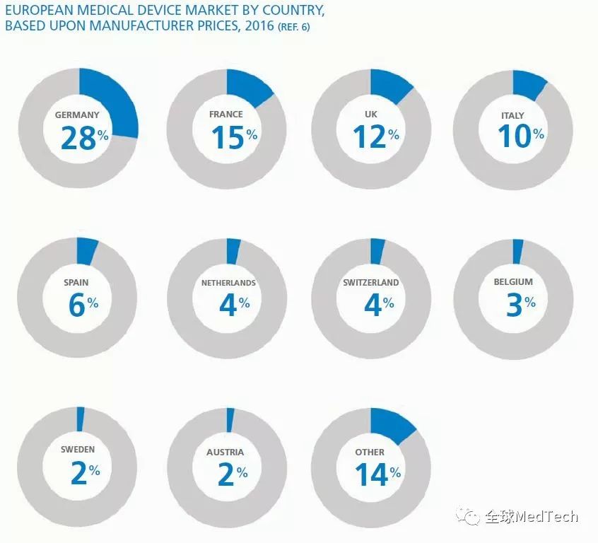 欧洲医疗技术产业(医疗器械+体外诊断)2016年已达1,100亿欧元,约占全球市场的29%,是居美国(占全球43%)之后的世界第二大市场。欧洲医疗器械产业的年复合增长率为4.4%(2008年-2016年),稳定且相对缓慢。 医疗器械市场,德国以占欧洲28%遥遥领先,法国、英国和意大利位列其后。 体外诊断市场,德国同样以占欧洲21%高居榜首,意大利、法国和西班牙紧随其后。 欧洲约10%的GDP用于医疗保健支出,而其中的7.2%用于医疗器械和体外诊断(每个国家从5%到10%不等)。2016年欧洲在医疗器械和体外诊断方面的人均支出为203欧元。