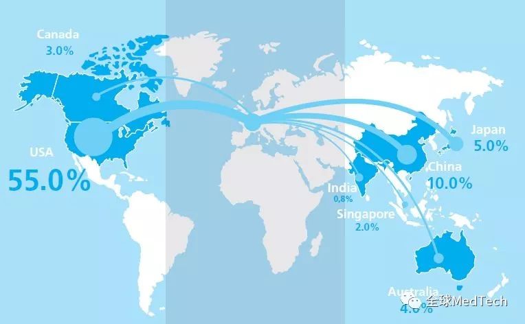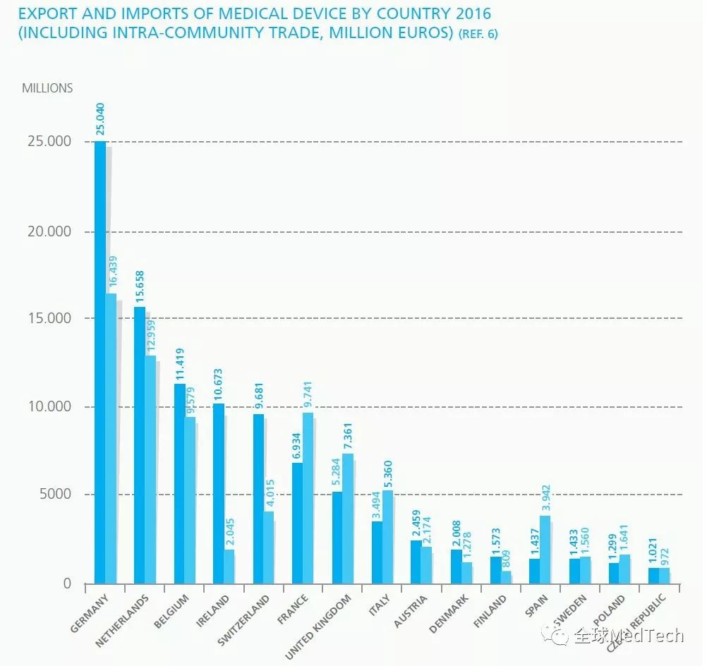 欧洲医疗器械产品的主要出口国为美国(36.9%)、中国(10.3%)、日本(5.4%)以及俄罗斯(2.8%)。 欧洲医疗器械产品的主要进口国为美国(55.0%)、中国(10.0%)、日本(5.0%)、澳大利亚(4.0%)以及加拿大(3.0%)。