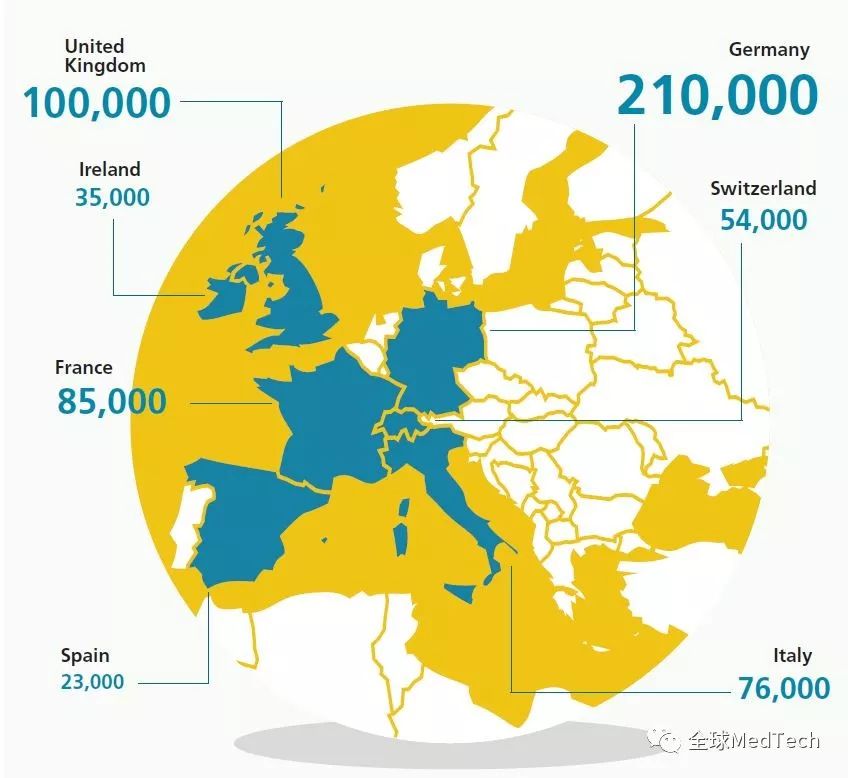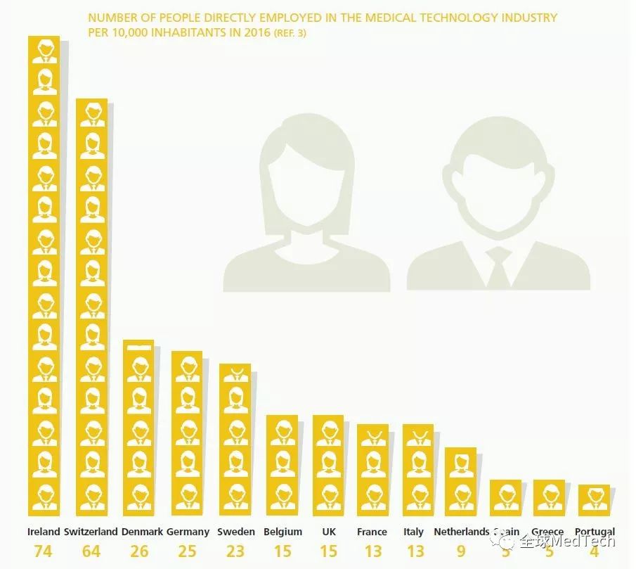 医疗技术产业与创新息息相关。一个新产品上市后,通常在18至24月中就会有升级版产品的出现。2016年欧洲专利局收到12,263件医疗技术相关的专利申请,占了当年总申请量的7.7%,是所有领域中最多的。与之对应的是,制药业和生物技术产业当年的专利申请数量分别为为5,754和5,744。在最近的十年中,医疗技术产业每年的专利申请数量已经翻番,而制药业和生物技术产业则相对停滞。 在所有的12,263件专利申请中,41%来自欧盟28国及挪威和瑞士,38%则来自于美国。 欧洲目前有67.5万人从事医疗技术产业,与此对应的是,欧洲制药业从业人员数量是74万。 德国以21万人居首,接下来分别是英国(10万)、法国(8.5万)、意大利(7.6万)和瑞士(5.4万)。 如果按照每1万人口从事医疗技术产业的数量,爱尔兰以74位居第一,其次是瑞士(64)、丹麦(26)和德国(25)。