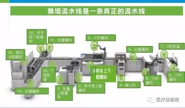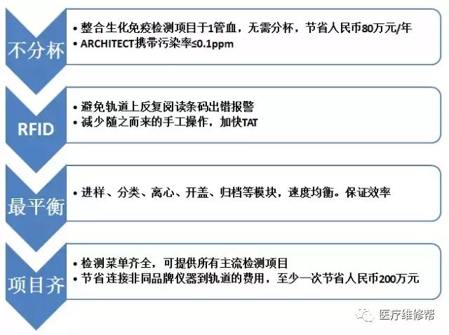 目前临床上80%以上的疾病诊断都依靠IVD;在疾病预防、诊断、监测以及指导治疗的全过程中,也发挥着极其重要的作用,被誉为医生的“眼睛”。 从全球市场来看,目前发达国家成熟市场的IVD已经达到一个相对稳定阶段,欧美国家未来持续增长预计在5-6%左右,其动力呈现稳步放缓态势;然而中国市场预计未来增长率将达到10%,因此也成为了“兵家必争之地”。硝烟四起,群雄逐鹿! 顶级实验室自动化系统(laboratoryautomation system,LAS)为化解临床实验室所面临的问题提供了很好的契机。 纵观IVD国际品牌的发展历程,都是从低速生化朝高速生化发展,由单机朝向集成化、自动化、流水线的方向发展。由于中国病人的过度集中于大型三级医院,年收入超过10亿的医院每天样本量超过1000个,高速仪器是高端医院的刚需,因此研发高速仪器的能力也是未来进入大型公立医院的前提要求,流水线、生化免疫联机是大势所趋。 顶级实验室自动化发展共经历了三代系统: 第一代 1950年 — 分析器自动化(试剂盒) 第二代 1970年 — 分析系统自动化(试剂、硬件&软件) 第三代 1990年 — 实验室自动化系统(合并&整合) 在目前的中国自动化流水线市场,国外厂商凭借其丰富的技术和经验仍然独占鳌头。 雅培诊断 公司简介: 雅培诊断专注于疾病的早期发现、诊断、治疗检测全过程,为实验室提供前处理、自动化、生化、免疫、血液和信息化产品等完整解决方案。跨越医疗保健领域——为医院,参考实验室,分子学实验室,血站,诊所和临床医生提供医学诊断设备、检验和自动化信息化解决方案。 雅培诊断官网:http://www.abbott.com.cn/homepage.html 产品:ACCELERATOR a3600 产品优势 可扩展性 医院是在不断的发展中,标本也会不断的增多。雅培ACCELETATOR a3600设计之初就考虑到流水线的可扩展性, ACCELETATOR a3600是一条能够随着医院的成长而不断成长的流水线。 每一条ACCELETATOR a3600都是独一无二的,都是根据用户需求而量身打造的。 每个系统可整合高达99个模块 轨道速度最大可高达3600管样本/小时 无论现在还是未来,实验室都不用担心工作量的增加 西门子医疗 公司简介: 西门子医疗中国将医学影像技术(比如:磁共振、放射治疗和超声) 、实验室诊断技术、治疗和医疗信息技术解决方案全面融合在一起,并辅以咨询和支持服务。从预防、早期检测、诊断到治疗和后期护理,西门子医疗能够为整个医疗流程提供解决方案。西门子还提供出类拔萃的 医疗融资服务 ,并且西门子中国也是重要的医疗教育服务提供者。 西门子医疗官网:http://www.siemens.com/entry/cn/zh/#product/2548370 产品:Aptio 自动化流水线 产品介绍 Aptio 自动化解决方案是一套为解决业务量变化和不断扩展的临床实验室需求而开发的解决方案。 通过将优异性能、适应能力、智能技术与西门子独具一格的自动化业务流程专业知识经验相结合,实验室在业务优化方面具备了可拓展性。 凭借 Aptio自动化解决方案,各种规模的实验室运营能顺应变化的要求,发挥理想的生产能力 产品优势 凭借Aptio自动化解决方案,实验室的检测能力即可与不断发展的检测环境保持同步扩张,适应并调节日益增长的业务量,而不会影响实验室的正常运行。 自动化仪器与分析前模块、分析后模块所构成的扩展型产品组合可为用户定制配置方案,适应各种实验室的环境要求。 Aptio自动化解决方案可使您的实验室轻松自如地逐步实现计划目标,最好地契合您的需求。 智能技术 Aptio自动化解决方案可与西门子各种型号自动化仪器相连接。还能藉着功能强大的数据集中技术,利用西门子CentraLink?数据管理系统提供综合性预分析和事后分析。 CentraLink?数据管理系统可促进自动查证、全面质控管理及样本跟踪,将实验室人员从耗费时间的繁重任务中解放出来。 通过西门子远程服务更可有效、主动发现系统问题,防患于未然,增加设备的正常工作时间。 罗氏诊断 公司简介: 罗氏诊断致力于开发和提供从疾病的早期发现、预防到诊断、监测的创新、高性价比、及时和可靠的诊断系统和解决方案,从而帮助医务人员提高患者的治疗效果,改善人们生活质量,并减少社会医疗成本。 公司产品销售及服务网络遍布全国各地,以其一流的技术产品,配以完善的服务赢得了广泛的市场及信誉。罗氏诊断对中国市场作出坚定的承诺,将以提高检测效率和医学价值来为中国的医疗健康事业和人民生活质量的提高作出卓越贡献。 罗氏诊断官网:www.roche-diagnostics.cn 产品:cobas? connection modules CCM 产品介绍 CCM是一个服务于整个实验室的样本前处理自动化系统,她卓越的功能和具有前瞻性的设计理念必定能满足医院检验科自动化改造的需求。 可连接罗氏cobas 8000及cobas6000模块化组合分析仪器和后处理系统,连同中间体软件cobas IT 3000,提供全方位的实验室解决方案。 产品优势 通过轨道将独立的前处理系统与罗氏生化免疫分析系统连接起来,实现了标本的自动传输。 保持了原有为线下样本服务的特点,能够对其他仪器或手工检测项目进行样本前处理,真正实现了一线多用。 轨道中是以五管架的模式进行传输其优势是: 架式的传输模式提高了轨道运输效率; 避免了由于条码扫描节点多,造成单个样本的条形码不识别而影响整条线的运 输速度甚至停机的情况发生。 增加了轨道运输后免去实验室人员手工搬运样本的麻烦,