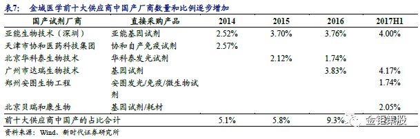 4 ICL为上游国产高性价比试剂厂商带来新机遇 成本压力大,ICL逐步转向国内高性价比试剂厂商。目前国内ICL企业体量都还比较小,并且下游客户医院相对议价能力强,而上游的试剂厂商尤其是高端的试剂厂商均是以海外巨头为主,议价能力也较强。这也就导至了国内目前ICL企业的利润率普遍不高。尤其是在竞争愈发激励、医院控费压力增大的背景下如何实现降本增效是国内ICL企业亟待考虑的问题。降本增效主要有三大方向:1)做大规模,发挥规模化效应的同时增强对上下游的议价能力;2)加强精细化管理,提升信息服务能力、物流效率和质量管理能力;3)从成本端寻找到性价比更佳的供应商。在国内检验试剂厂商逐步实现技术突破后ICL企业也开始纷纷转向性价比更高的国产试剂厂商。金域医学为例,公司每年采购的原材料成本占营业成本比例均在50%左右,并且近年来比例还在逐步上升,这说明对于国内ICL企业而言控制成本是未来发展的关键所在。我们可以从金域医学的前十大供应商变化中看到,国产试剂供应商数量和比例均在逐步增加。国产试剂供应商的数量从2014年的两家(亚能生物+天津协和医药)增加到了2017年的4家(亚能生物+达瑞生物+安图生物+贝瑞和康),采购的占比也从5.1%快速上升到了12%。