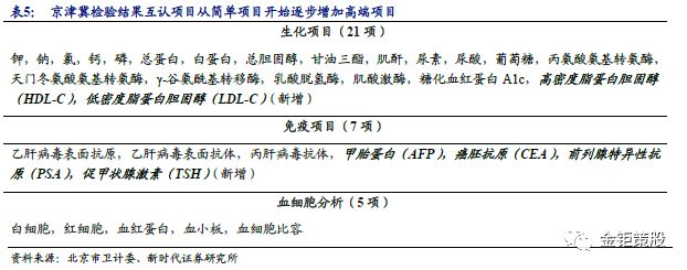 2.3、 医联体:区域检验中心是ICL发展新趋势 检验结果互认制度推广,大型ICL检测能力获认可。2018年1月国家卫计委公布了《进一步改善医疗服务行动计划(2018-2020年)》,从顶层设计角度再次确认了检查检验结果互认制度。早在2016年10月起,京津冀三地就启动了检验结果互认工作,三地132家医疗机构的部分检验结果已实现互认。临床检验结果互认的项目共27项,包括19项生化项目、3项免疫项目和5项血细胞分析项目。这27个检验项目为临床实验室最为常用、有质量标准、有室间质评计划、易于标准化、且有一定地方互认工作基础的检验项目,如白细胞、红细胞、血小板、乙肝病毒表面抗原、乙肝病毒表面抗体等。首批132家医疗机构由127家三级医院和5家独立检验实验室组成,分别是北京迪安临床检验所,北京洛奇临床检验所,天津金域医学检验所,天津迪安执信医学检验所和天津爱迪康医学检验所。2018年3月1日起,为贯彻落实京津冀协同发展战略,提升区域内医疗机构临床检验质量,方便群众看病就医,又新增了165家医疗机构和6项互认项目,新增了一批二级医院。大型ICL首批即和三级医院一起纳入检验结果互认机构,ICL的检验能力获得了认可。