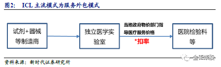 降本增效是ICL的核心,外包服务主要商业模式。对比医院的检验科和病理科,ICL具备两大竞争优势:1)成本和效率优势。基于专业化分工的基础,ICL将分散于各个医院等检验需求集中化,一方面可以集中化采购,利于降低成本,另一方面更具有规模化运营,降低单次检验成本。2)追求质量的优势。ICL市场化运营下,更有动力投入技术研发去追求品牌背书,去保证检验结果的准确性与权威性,可以得到更多医院的认可。通过ISO 17025、ISO 15189 国际质量体系、美国病理学家协会CAP 等国际性组织认可,是ICL企业的目标。ICL主要采用外包服务的商业模式,实验室向医院检验科等承接项目时,以当地政府物价部门指导医疗服务价格为基础,并结合具体医院情况乘以折扣报价。折扣报价指独立实验室收取医院的检测费用与政府核准的医院检测收费标准的比例。如政府核准收费标准为100元,实验室收取医院合作检测费为65元,则折扣报价为:65%。医院倾向于将临床科室确有需求但院内尚未开展的项目,或院内检测成本过高、质控困难的项目外送检验。在国内目前三级医院人满为患,部分二级及以下医院和基层医疗机构检测样本较少、医疗设备投入匮乏的背景下,医院检测项目服务外包的ICL是一个非常好的补充方式。