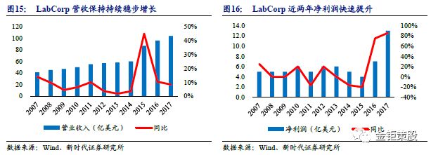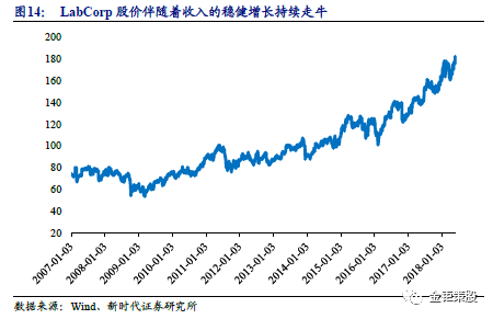 LabCorp营收持续稳步增长,驱动股价持续走牛。LabCorp是美国第二大的ICL企业,2017年营收798亿元,净利润99亿元,最新市值182亿美元,股价从1998年3元附近,到目前的182元,20年期间增长了60倍。在过去10年中,LabCorp的营收都保持了稳步的增长,从2007年的317亿元增长到了798亿元。净利润2015年前有所波动,但近两年净利润开始快速提升。收入的稳步增长,净利率的提升驱动公司股价持续走牛。