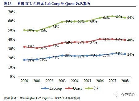 3 他山之石:美国ICL龙头LabCorp的制胜策略 美国医疗机构市场化程度高,成就了两大ICL龙头Quest和LabCorp。纵观海外,发达国家如美国、日本、欧洲的医疗体系特点都与中国不同,他们相对而言集中的大型医院较少,而民营私立医院甚至私人诊所较多,这就为ICL的发展提供了非常好的土壤。其中美国ICL的渗透率为35%,欧洲的渗透率接近50%,日本的则更是高达67%。美国整体诊断检验市场规模庞大,且分散化的医疗结构给ICL快速发展带来了非常好的土壤,同样由于马太效应的存在,目前美国ICL主要被Quest和LabCorp垄断,两者合计的市占率超过了60%。美国ICL诞生于20世纪50年代,20世纪60年代-90年代同样是受益于美国政府和商业医疗保险机构大力推行控制医疗费用支出以及《临床实验室改进修正方案》推出,ICL进入黄金发展时期,ICL的渗透率快速提升至了35%。进入20世纪90年后,ICL整体市场占有率基本保持稳定,行业内部出现密集的兼并重组,行业集中度快速提升,最终形成LabCorp和Quest双寡头垄断格局。而美国ICL的龙头LabCorp的成功路径对国内ICL企业有非常好的借鉴意义。