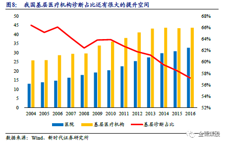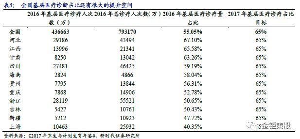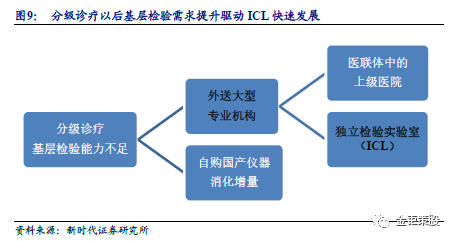 分级诊断政策推升基层检验需求,驱动ICL快速发展。2015年9月,国务院办公厅发布了《关于推进分级诊疗制度建设的指导意见》,制定了2017年分级诊疗试点工作考核评价标准,明确了提出2017年基层医疗诊疗占比须达到65%。2017年,全国分级诊疗试点城市数达到321个,占地市级以上城市的94.7%。各地根据不同情况,分别摸索出以慢性病为突破口、以构建医联体为切入点、以诊疗病种为抓手、以家庭医生签约服务为基础、以医保政策为引导等各具特色的分级诊疗做法。四川省分级诊疗的重心在于远程医疗和慢病管理,上海分级诊疗主要以家庭医生签约服务为代表,而深圳着重于推广医联体模式,绑定大医院与基层医院利益使医患利益趋同。分级诊疗政策有众多的考核指标,但最核心的指标还是基层医疗诊疗量占比。提升基层医疗诊断量的占比是为了解决目前三级医院看病排队时间长、医患关系紧张等问题。目前我国平均的基层医疗机构诊断占比仅55%,离目标的65%还有很大的提升空间。分级诊断的最终理想状态是希望实现按照疾病的轻重缓急及治疗的难易程度进行分级,不同级别的医疗机构承担不同疾病的治疗。从全科检查到专科治疗的分级诊疗模式,实现基层首诊、双向转诊、急慢分治、上下联动,最终形成小病在社区,大病进医院,康复回社区。分级诊断的推进将带动基层医疗机构检验需求的增加,而目前在基层医疗机构分布分散、资金投入有限、检测仪器和服务能力都较差的背景下,检验服务外包的需求驱动了ICL的快速发展。