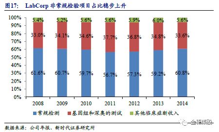 3.1、 多样化检验项目,大力拓展特检项目 发展多样化的检验项目,尤其是特检项目。在LabCorp发展初期主要依靠常规检验项目做大规模,后期主要是依靠特检项目获取利润。从2008-2014年公司财报披露数据看,非常规检验项目的占比在稳步上升。而在拓展检验项目上,除了公司自身研发投入储备之外,从2000年以后,公司借助行业整合浪潮,进行了多起并购案例,不断丰富自己的项目。