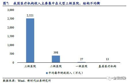 2 医改助力“降本增效”为核心的ICL腾飞 目前我国已经实现了全国人民的医保覆盖,解决了“看病难、看病贵”的问题。但是目前仍然存在医院和患者供需不匹配以及医保费用支出超限的问题,医疗改革来解决这些问题的核心在于“降本增效”,而ICL是降本增效非常有效的方法之一。在分级诊断+医保控费等医改政策支持下,我国ICL行业有望实现腾飞。 2.1、 分级诊疗:基层需求释放,带动检验外包需求快速增长 医疗资源不足和分配不均,基层医疗机构资源匮乏导至检验需求被压制。目前我国80%的医疗资源集中在城市,其中80%又集中在大城市的大中型医院。基层医疗机构医疗资源相对缺乏、服务能力有待提升,仅依靠公立医院现存的检验资源无法满足基层需要。目前我国医疗体系的政府投入还是主要在大型的三级医院,目前三级医院的年财政专项支出为2521万元/家,而数量众多的一级医院和基层医疗机构的年财政支出仅30万元/家都不到。这也就导至了众多的基层医疗机构没有资金和实力采购大型的检测设备,目前基层医疗机构万元以上的设备平均数量仅0.69台。检测设备的短缺导至了基层检验需求被压制。