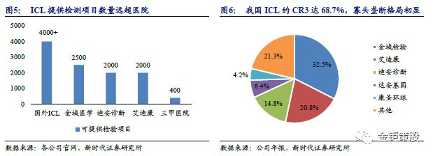 1.2、 中国ICL市场潜力巨大,马太效应带来强者恒强 海外对比我国ICL潜力巨大,马太效应带来强者恒强。虽然近年来我国ICL发展迅猛,但整体业务量仅占整个医学检验市场的比例仅5%左右,与美国ICL的渗透率35%、欧洲的50%、日本的67%相比还有非常大的差异。虽然我国医疗体系结构决定了ICL的渗透率不会有美国、日本等发达国家那么高,但目前5%左右的渗透率仍有较大的提升空间。叠加我国目前医学检验整体市场仍保持了15%左右的快速增长,我国ICL仍将继续保持快速发展。目前国外的ICL可以提供的检测项目已经超过了4000种,国内大型的ICL提供的检测也达到了2500项,而目前国内大型三甲医院的检测项目才仅300-500项。作为公立医院检验的有效补充,在分级诊断、医保控费、医疗体等政策助力之下我国ICL市场潜力巨大。ICL最核心的意义在于集合分散的检验需求从而实现降本增效,因此规模化马太效应十分显著。根据2016年销售数据来看,金域医学营收32.2亿,艾迪康约20亿,迪安诊断约14亿,市场占有率分别约32.5%、21%、14.8%,CR3达到了68.7%,与美国TOP2的市场份额相当。马太效应推动强者恒强,行业高度集中是必然的发展趋势。