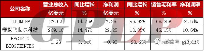 图四:上游测序仪制造商的市场分布情况 此外,从技术角度来说,基因测序仪的核心显然正是其测序技术,从全球来看,目前应用最广、最稳定的基因测序技术是第二代测序技术,也就是常说的高通量测序技术,但高通量测序仪市场恰好被上述几个国外龙头所垄断。 当然,这跟第二代测序技术的发展史有关——技术发展初期,由于技术的不成熟,企业多以自主研发为主。当市场发展成熟之后,企业间并购随之增多,例如2006年Illumina收购Solexa、2007年Roche收购454 Life Sciences、2010年 Life Technologies 收购Ion Torrent 等。也正是因为这种发展模式,使得第二代测序在发展初期,出现诸强争霸的格局。随着技术发展到一定的阶段以后,优秀的产品不断提升以及大鱼吃小鱼的行业整合,进一步促使行业集中度不断攀升,形成了如今强者恒强的市场局面。 从公司业绩上来看,Illumina和Thermo Fisher公司的营收和净利润相较于2016年有显著的提升,但是由于与罗氏合同终止使得PACIFIC BIOSCIENCES2017年公司业绩出现显著下滑。