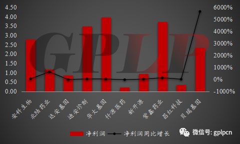 图八:2017年国内基因测序公司净利润及增长率的情况(亿人民币)