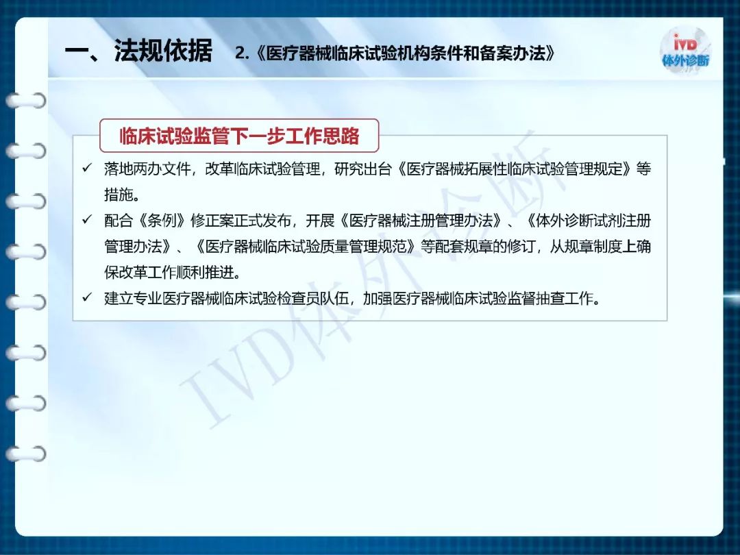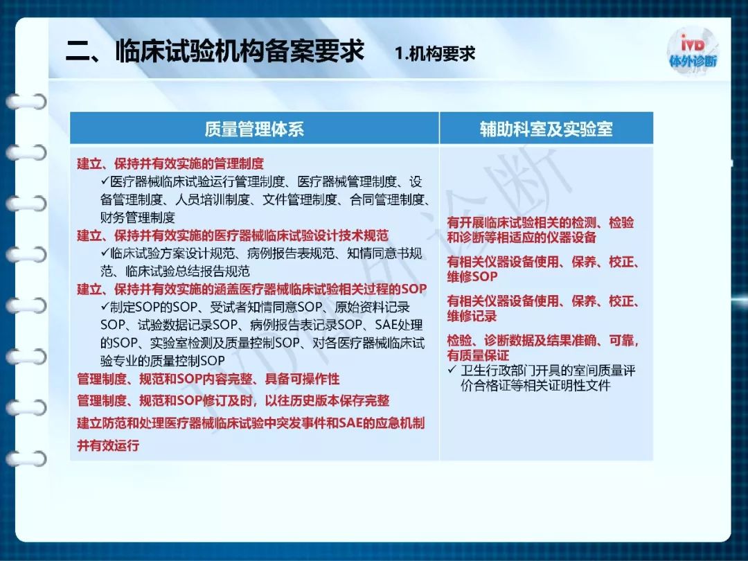 《备案办法》分为总则、备案条件、备案程序、监督管理和附则五章共二十条。 总体要求,明确了目的、定义和适用范围,适用于在我国境内开展医疗器械临床试验的临床试验机构备案。 备案条件,明确了医疗机构备案应当具备的条件等相关要求;为了加强对高风险医疗器械管理,保证受试者安全和提高临床试验质量,规定对列入需进行临床试验审批目录的第三类产品,应当在三级甲等医疗机构专业范围内开展临床试验;规定开展创新医疗器械产品或需进行临床试验审批的第三类医疗器械产品临床试验的主要研究者应具有高级技术职称并且参加过3个以上医疗器械或药物临床试验等等。 备案程序,由食品药品监管总局组织建立医疗器械临床试验机构备案管理信息系统(以下简称备案系统);医疗器械临床试验机构办理备案获得备案号后可以承担医疗器械临床试验。 监督管理,明确了省级以上食品药品监管部门和卫生计生行政部门按照分工负责组织开展对临床试验机构的监督管理和信息沟通等职责。