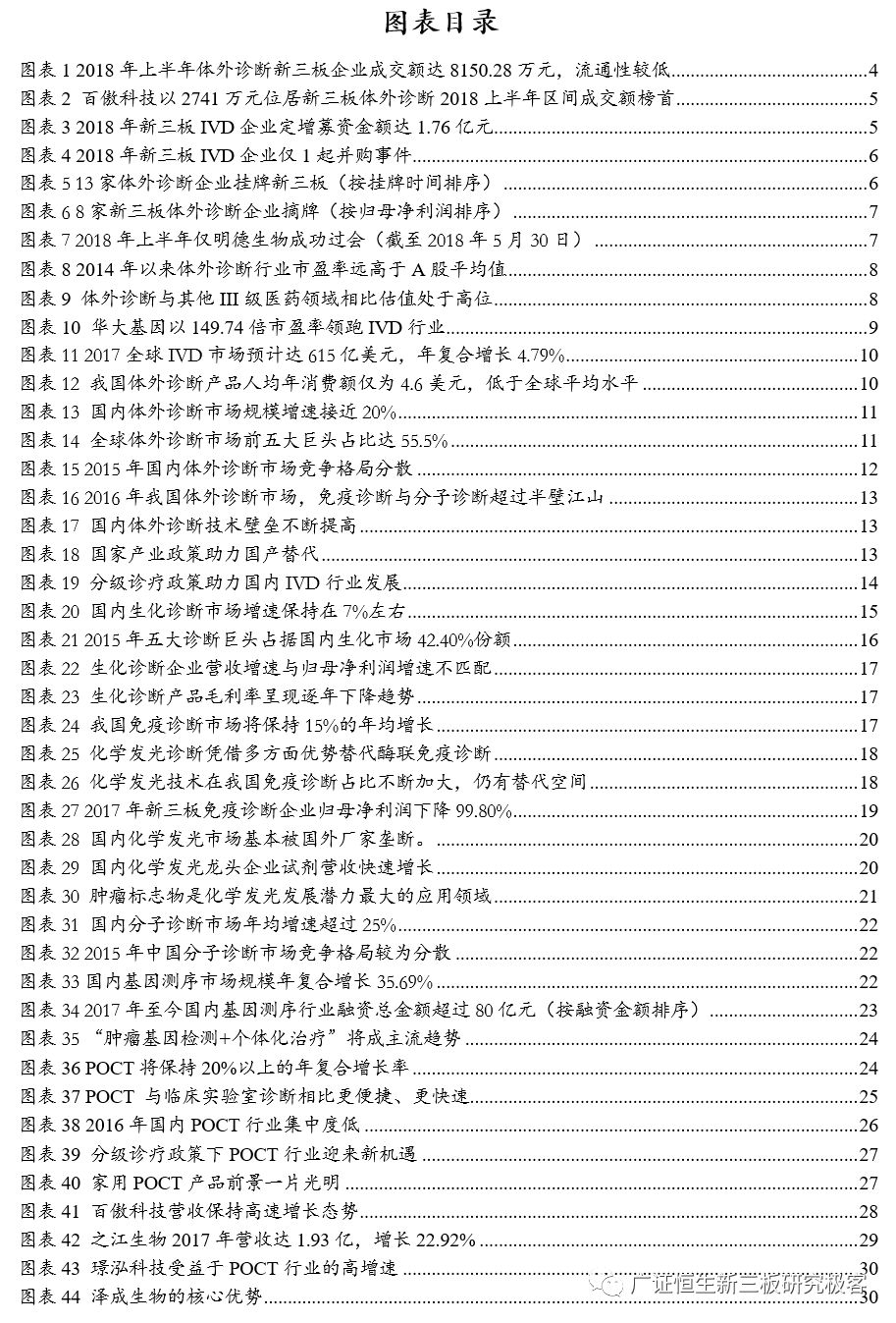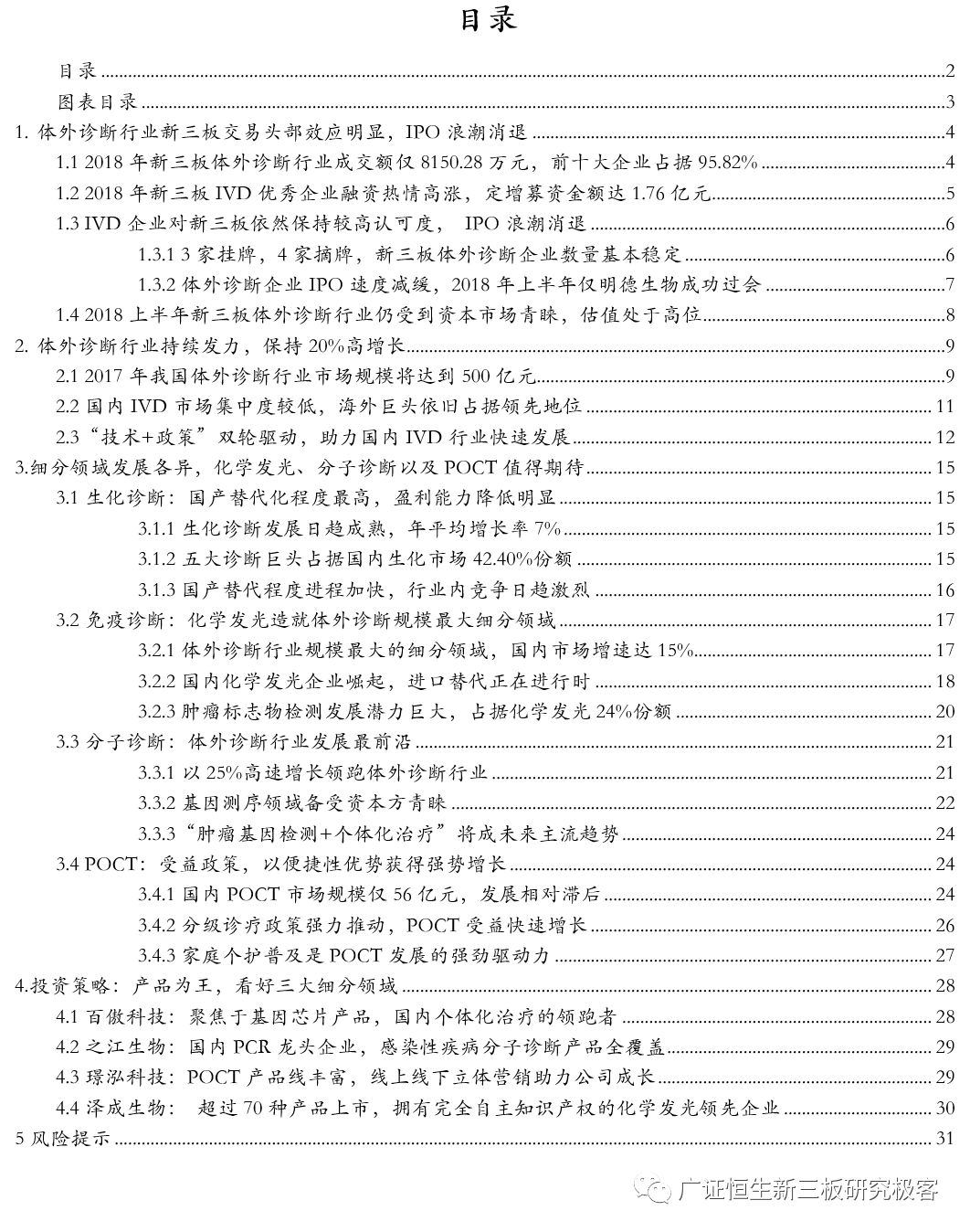 细分领域发展迥异,化学发光、分子诊断以及POCT值得期待。体外诊断细分领域发展格局各异:(1)生化诊断:国产替代化率接近80%,盈利能力显著下降,新三板企业营业收入在保持33.44%增速的情况下,净利润仅仅增长8.95%.(2) 免疫诊断:化学发光技术壁垒已被突破,国内化学发光企业崛起,新产业、安图等企业增速均超过30%;(3)分子诊断:以超过25%的行业增速快速发展,测序行业融资火热,“基因检测+个体化治疗”将成主流趋势;(4)POCT:受益于分级诊疗和家庭个护普及,POCT产品持续放量,保持强劲增长。 【投资策略】 我们认为体外诊断行业整体依然处于快速发展的阶段,而聚焦于细分领域,分子诊断、POCT以及化学发光领域值得我们重点关注。 分子诊断:看好拥有已经被市场认可的成熟产品的细分领域龙头(1)百傲科技(430353.OC):聚焦于基因芯片产品,国内个体化治疗的领跑者,(2)之江生物(834839.OC):国内PCR龙头企业,感染性疾病分子诊断产品全覆盖; POCT:看好拥有丰富产品及广泛销售渠道的POCT公司璟泓科技(430222.OC):产品线丰富,辅以线上线下立体营销; 化学发光:看好拥有项目齐全、品质优良产品的企业泽成生物:拥有超过70种普检+特检化学发光上市产品,媲美海外巨头、拥有完全自主产权的检测系统。