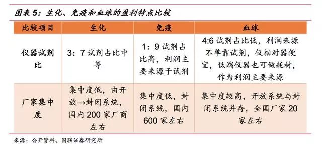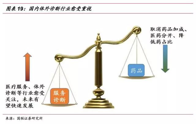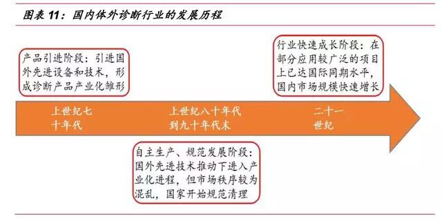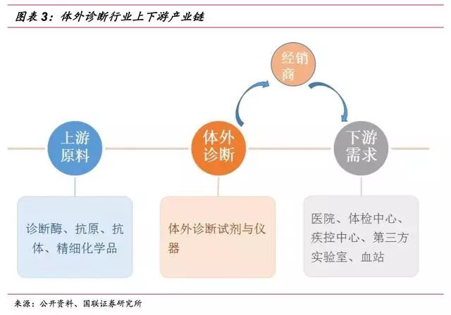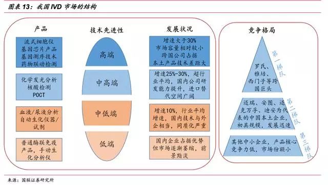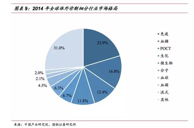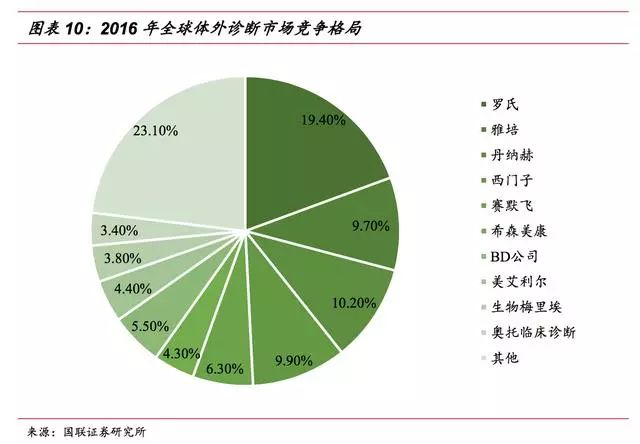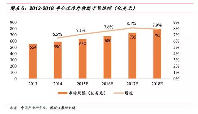 ▌ 体外诊断行业是医疗器械板块子行业,体外诊断产品属于医疗器械的一种,包括体外诊断仪器和配套的诊断试剂。因体外诊断产品不直接作用于人体,在《医疗器械分类规则》中将其划分为“非接触人体器械”类别。 体外诊断是指在体外通过对人体体液、细胞和组织等样本进行检测而获取临床诊断信息,进而判断疾病或机体功能的诊断方法。体外诊断是临床诊断信息的重要来源,能够为医生治疗方案及用药提供重要参考指标,是保证人类健康的医疗体系中不可或缺的一环。 此外,在优生优育、公共卫生、疾病预防等领域,体外诊断也起到了举足轻重的作用。 体外诊断按其检测方法或检测原理可分为生化诊断、免疫诊断、分子诊断、微生物诊断、血液诊断等诊断方法,其中生化、免疫诊断是目前国内体外诊断的主要方法,占整个体外诊断市场60%以上的份额,而分子、POCT等新兴诊断领域近年来发展迅速,涌现出大批优质上市公司。 ▌ 体外诊断行业是由上游原材料、体外诊断试剂和仪器、下游需求共同组成。 上游的关键原材料主要包括酶、抗原、抗体等; 下游的消费需求主要来自医疗检测和血液筛查,医疗检测是体外诊断产品最主要的消费方向,包括医院、体检中心、独立实验室、疾病预防控制中心等,而血液筛查主要是采供血部门对于血液的检测,包括各类血站和血制品厂家。 由于上游原材料的研发生产难度较大,国内企业在生产工艺、纯度上与国外有较大差异,主要依赖进口。目前仅有安图生物、迈克生物等少数几家企业能实现部分酶、抗原、抗体等上游原材料的自给,但一些关键性的原料仍依赖进口。 下游需求主要与国家和地区的经济发展状况、医疗服务水平等因素有关。 总的来说,欧美等发达国家诊断市场成熟,下游需求旺盛;而以金砖四国为首的新兴发展中国家体外诊断发展较晚,终端需求缺口较大,空间广阔,将保持快速增长态势。 体外诊断厂商主要采取仪器+试剂联动销售的模式,通过投放、租赁、低价销售等形式将体外诊断仪器提供给医疗机构或经销商,以此建立稳定的合作关系,带动体外诊断试剂的销售。联动销售作为一种新兴业务模式,已被行业内的企业广泛接受。 整个体外诊断行业收入来源以试剂销售为主,通过扩大低毛利的仪器投放来带动配套试剂和耗材的销售。其中,免疫诊断由于化学发光检测系统的封闭性,试剂依赖性较强,试剂占比高达90%;而血球诊断仪器相对便宜,部分低端仪器甚至可当耗材,作为利润主要来源,仪器试剂比为4:6。 总的来说,由于诊断试剂为一次性消耗品,市场需求较大,体外诊断厂商主要靠试剂盈利。 ▌ 全球体外诊断市场稳步增长 随着各种高新技术的快速发展,以及大部分国家医疗保障政策的逐步完善,近年来体外诊断行业得到了快速的发展。 根据EvaluateMedTech公司发布的《2015-2020全球医疗器械市场》,2013年,体外诊断占据全球医疗器械市场份额的13%,是医疗器械行业最大的细分子行业;预计到2020年,体外诊断市场份额将达到14.1%。 从市场规模来看,近年全球体外诊断市场保持稳步增长的态势,根据印度市场研究公司Rncos发表的《GlobalPoint-of-CareDiagnosticsMarketOutlook2018》数据,2013年,全球体外诊断市场规模为554亿美元,2014年增长至590亿美元,预计2015-2018年间将保持7-8%左右的增速,2018年全球体外诊断市场规模有望达到793亿美元。 不断增加的传染病、慢性疾病人数带来诊断需求的增加,以及体外诊断技术的不断提高是体外诊断行业发展的主要动力。 从地区分布来看,体外诊断市场规模与各国家或地区的人口总数、经济发展水平以及医疗保障和服务水平等因素相关,其中以美国、欧盟、日本为代表的发达经济体占据着主要份额,合计占全球体外诊断市场的80%左右。 然而,发达国家的IVD市场经过多年的发展已相对成熟稳定,预计未来将以1-2%的速度增长;而以中国、印度为代表的新兴经济体由于基数小、弹性大的特点,预计体外诊断市场未来将保持10-15%的复合增速。 从各细分市场的规模上看,2014年全球体外诊断细分市场占据份额最大的是免疫诊断,约占23.9%,血糖、POTC以16.8%和12.4%的占比紧随其后,分子诊断等新兴领域占比较低,具有较大的发展空间。 从行业竞争格局上看,全球体外诊断市场寡头垄断、强者恒强的局面。 全球市场份额排名前十的体外诊断公司中美国占了六家、欧洲三家、日本一家,其中罗氏占比19.40%,丹纳赫以10.20%排名第二,西门子和雅培紧随其后,全球前十家占比达到76.90%。 ▌ 行业处于快速发展期 我国体外诊断行业起步于上世纪70年代末,共经历产品引进阶段、自主生产阶段以及快速成长阶段。目前行业正处于快速增长期,在部分应用较广泛的项目如(生化、POCT)等已达到国际同期水平,行业整体规模快速扩张。 从发展速度上看,我国体外诊断行业正处于其行业周期中的快速成长期,国民经济的快速发展、人均可支配收入的增加、城镇化、人口老龄化、人们健康意识的增强、政策的支持以及体外诊断技术的进步等,推动着行业的进一步发展。 作为新兴发展国家中的代表之一,未来我国经济仍将处于持续高速发展阶段,相关的社会保障和人民的生活水平也不断提高。 随着我国政府对医疗卫生领域的投入增长,医疗服务和诊断行业随之崛起,都将给上游体外诊断行业带来大量的市场需求,驱动体外诊断