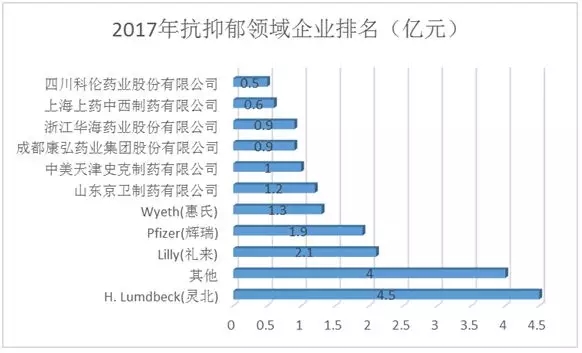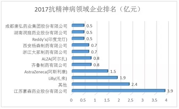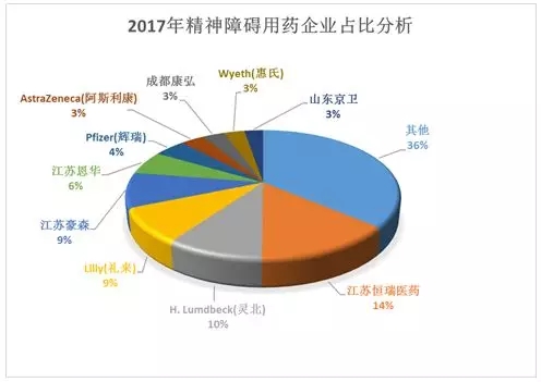 图2 2017年精神障碍用药企业占比分析 上述市场份额占比较大的前四位企业中,他们的侧重点各不相同,恒瑞主要是以右美托咪定为代表的催眠镇静类药物,灵北是一家专注于精神神经类的药企,在抑郁症、阿尔兹海默症、帕金森及精神分裂症等方面均有涉及,产品线覆盖广泛,礼来的主要产品为盐酸氟西汀、奥氮平、盐酸度洛西汀、盐酸托莫西汀,在抗抑郁方面表现突出,豪森在抗精神病领域,凭借奥氮平2017年3.9亿的销售额也表现不俗。 精神障碍细分领域各企业市场情况