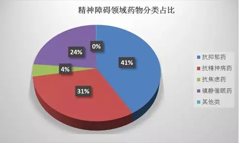 简述 精神障碍:指大脑机能活动发生紊乱,导至认知、情感、行为和意志等精神活动不同程度障碍的总称。精神障碍疾病发病机制复杂,治疗难度大,病情易反复,给患者、家庭和社会带来了沉重的负担。目前精神障碍以药物治疗为主,根据治疗药物适应症的不同,大体分为以下五类:1)抗抑郁药物;2)抗精神病药物;3)催眠镇静药物;4)抗焦虑药物;5)其他精神障碍用药。 本文将从国内精神障碍领域药物的市场情况、各企业市场占有率、各细分领域企业市场占有率、各细分领域畅销药物简介等方面进行介绍。后续将会选取在精神障碍领域表现较为突出的国内2家企业、国外2家企业进行介绍。 市场情况 根据样本医院数据库显示,2017年国内精神障碍用药大领域销售额为45.7亿,同比增长9.7%;这一大类包括抗抑郁药、抗精神病药、催眠镇静药、抗焦虑药和其他精神障碍用药这5类,如下图所示,抗抑郁药占主要份额(41%),占据了较大的份额,其次为抗精神病药(31%)。