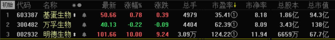 明德生物在近期股市上的表现可谓是一路飘红,但却面临着市盈率过高(超过124了)的风险,虽然企业未来前景看好,但是对于普通投资者来说此时落袋为安可能是更好的选择。对于万孚和基蛋来说,相比较今年一二月份的股价还略高,不过已经进入到可逐步建仓的时期!