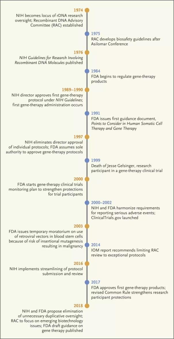 FDA批准的3种基因疗法(信息来源:FDA官网) 尽管我们还需要深入了解基因疗法技术的安全性和有效性,但目前已有许多有前景的新方法在不断涌现。例如,基因组编辑的出现为治疗具有挑战性或不能用基因转移技术解决的疾病开辟了新的可能性。使用锌指核酸酶(ZFNs),转录激活样因子核酸酶(TALENs)和大范围核酸酶编辑基因的能力已经有数十年历史。但5年前,随着CRISPR-Cas9基因编辑系统的发现和发展,基因编辑领域取得了巨大飞跃。目前已经有了首个ZFNs基因组编辑方法治疗亨特综合征的体内临床试验,也有临床试验正在探索CRISPR-Cas9和TALENs基因编辑方法用于T细胞免疫治疗。估计很快就会有第一个治疗镰状细胞病的临床试验。 随着基因疗法的不断变化,美国联邦政府也必须建立相应的监管措施。多年来,随着我们对基因疗法科学进展及风险的了解不断增加,监管系统也发生变化(见下图时间轴)。例如,在Gelsinger去世后,NIH和FDA合作开发了基因修饰临床研究信息系统(Genetic Modification Clinical Research Information System, GEMCRIS),该数据库旨在跟踪基因治疗产品,监测该领域的趋势,并开设面向公众的网站提供信息透明度。2018年7月,FDA发布了一套与基因治疗相关的指导文件草案,就某些领域的制造问题、长期随访和临床开发路径提出了新的指导意见,涉及血友病、眼科适应症和罕见病。