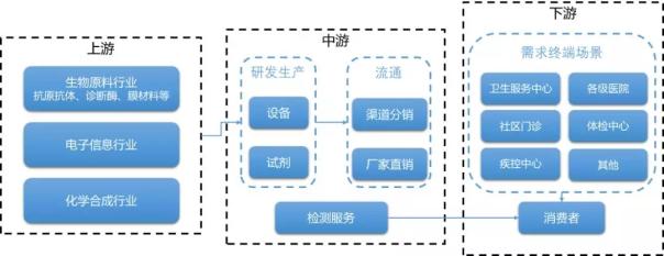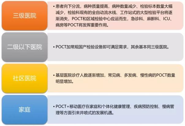 在当前阶段,政策环境、产业链上下游供求关系以及各种因素引起的需求增长,成为驱动POCT发展的主要因素。 在精准医疗大背景下,以体外诊断为代表的精准诊断成为发展刚需,尤其是POCT行业,以其方便快捷的特点在近年来保持了远高于全球增速的发展速度。 从定性到定量,从手工到自动,POCT产品在需求增长、政策扶持以及技术升级等因素的驱动之下,正不断向着实时、定量和“系统化、集成化、便携化、自动化、个性化、移动化”的方向发展,产品的稳定性、可靠性得到进一步提高,应用场景也将得到进一步扩展。 在当前阶段,政策环境、产业链上下游供求关系以及各种因素引起的需求增长,成为驱动POCT发展的主要因素。 政策环境 宏观政策大力扶持 “十三五”以来,我国发布的几乎每一项涉及到生物医药相关产业发展规划的宏观政策,都强调了要大力扶持体外诊断行业的发展。《“十三五”国家战略性新兴产业发展规划》、《“十三五”生物产业发展规划》、《“十三五”医疗器械科技创新专项规划》中,都有明确加快POCT技术发展、产品研发或者产业化等的具体条目。2017年底国家发改委发布的《高端医疗器械和药品关键技术产业化实施方案》中,更是将POCT的关键技术和主要指标写进了政策。 法规进一步完善,行业趋于规范 从行业管理规范来看,我国POCT行业尚处于发展初期,行业法律法规、行政监管政策以及企业质量管理体系标准等尚不完善,没有明确的法律法规来规范POCT行业管理。美国POCT行业监管体系完善,各州、市和单位都设有POCT委员会,配备协调员,相比之下,2004年POCT概念及技术引进中国之后,仅仅在2013年发布的国家标准中对质量保证能力提出了明确要求,但没有对操作人员执业管理规定,POCT产品各指标一致性差,各方结果不可比,导至医院对企业产品的使用黏性大。 体外诊断行业大多采用分销模式,试剂通过各级经销商到达需求终端,在两票制推行的今天,流通环节面临着大洗牌,也对体外诊断企业造成不小的影响。近日,国家市场总局发布《医疗器械唯一标识系统规则(征求意见稿)》,这意味着对于医疗器械流通领域来说,监管也会更加严格,对体外诊断行业来说亦是如此,政策整体走势走在向着趋于严格、规范行业的方向发展。 产业链上下游供求关系 POCT行业上游是许多原材料行业,主要包括生物原料行业、电子信息行业以及化学合成行业等,试剂上游包括精细化学品以及抗原、生物酶和高分子材料等生物原料供应商,仪器上游主要是电子元件和模具供应商。下游需求市场中,医疗机构占据了90%的市场,包括了各级医院、卫生服务中心、社区门诊、体检中心等。另外,诸如血糖仪和血糖试纸等在家庭和个人使用领域发展较为成熟的产品,也可以通过药店等零售终端直接到达消费者端。