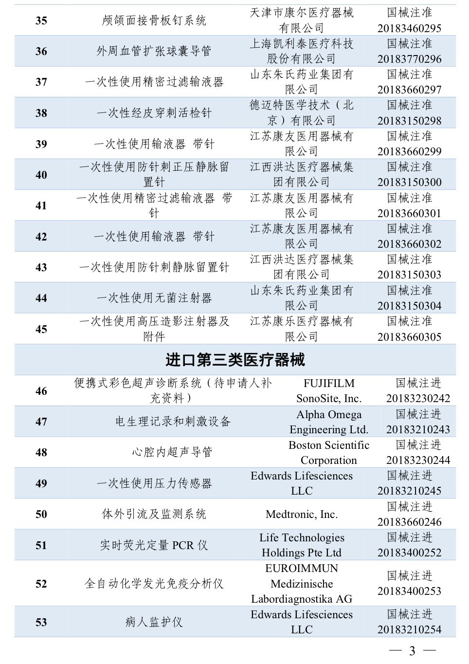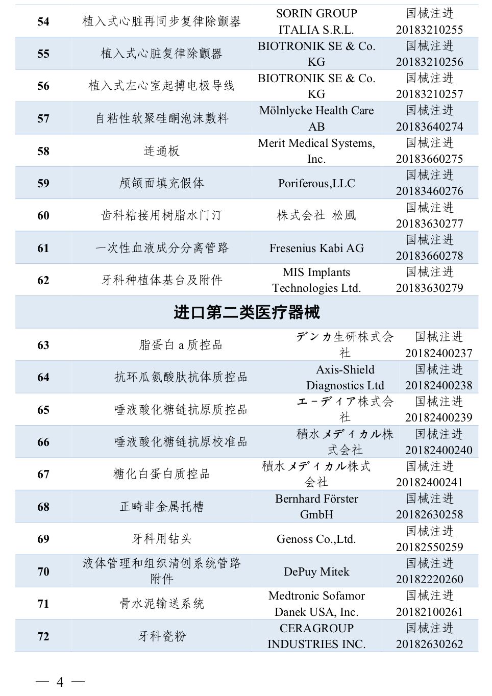 2018年7月,国家药品监督管理局共批准注册医疗器械产品84个。其中,境内第三类医疗器械产品45个,进口第三类医疗器械产品17个,进口第二类医疗器械产品22个(具体产品见附件)。 特此公告。 附件:2018年7月批准注册医疗器械产品目录 国家药品监督管理局 2018年7月,国家药品监督管理局共批准注册医疗器械产品84个。其中,境内第三类医疗器械产品45个,进口第三类医疗器械产品17个,进口第二类医疗器械产品22个(具体产品见附件)。 目录中涉及体外诊断(IVD)企业共有21家,其中境内第三类医疗器械产品8个,进口第三类医疗器械产品2个,进口第二类医疗器械产品11个。 以下为2018年7月批准注册的IVD产品: |