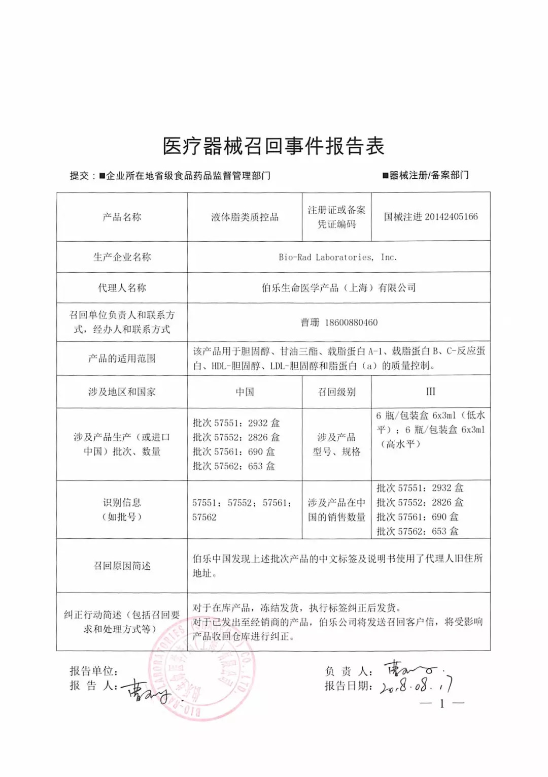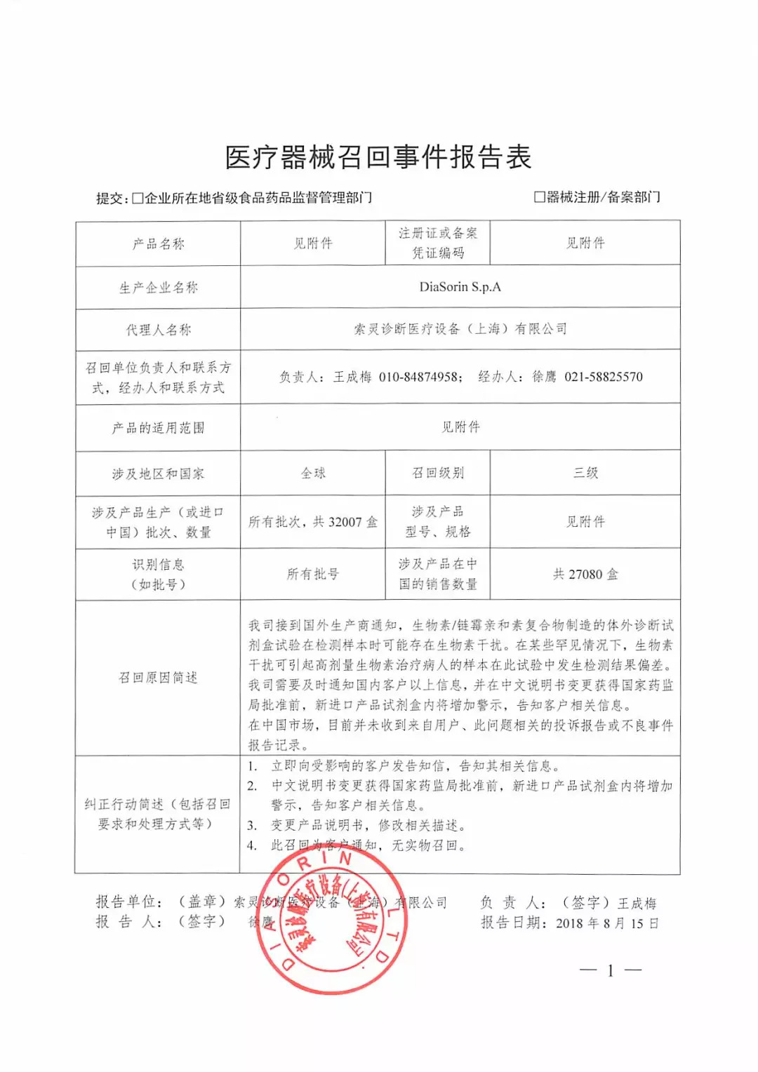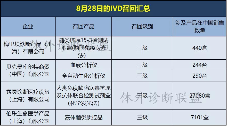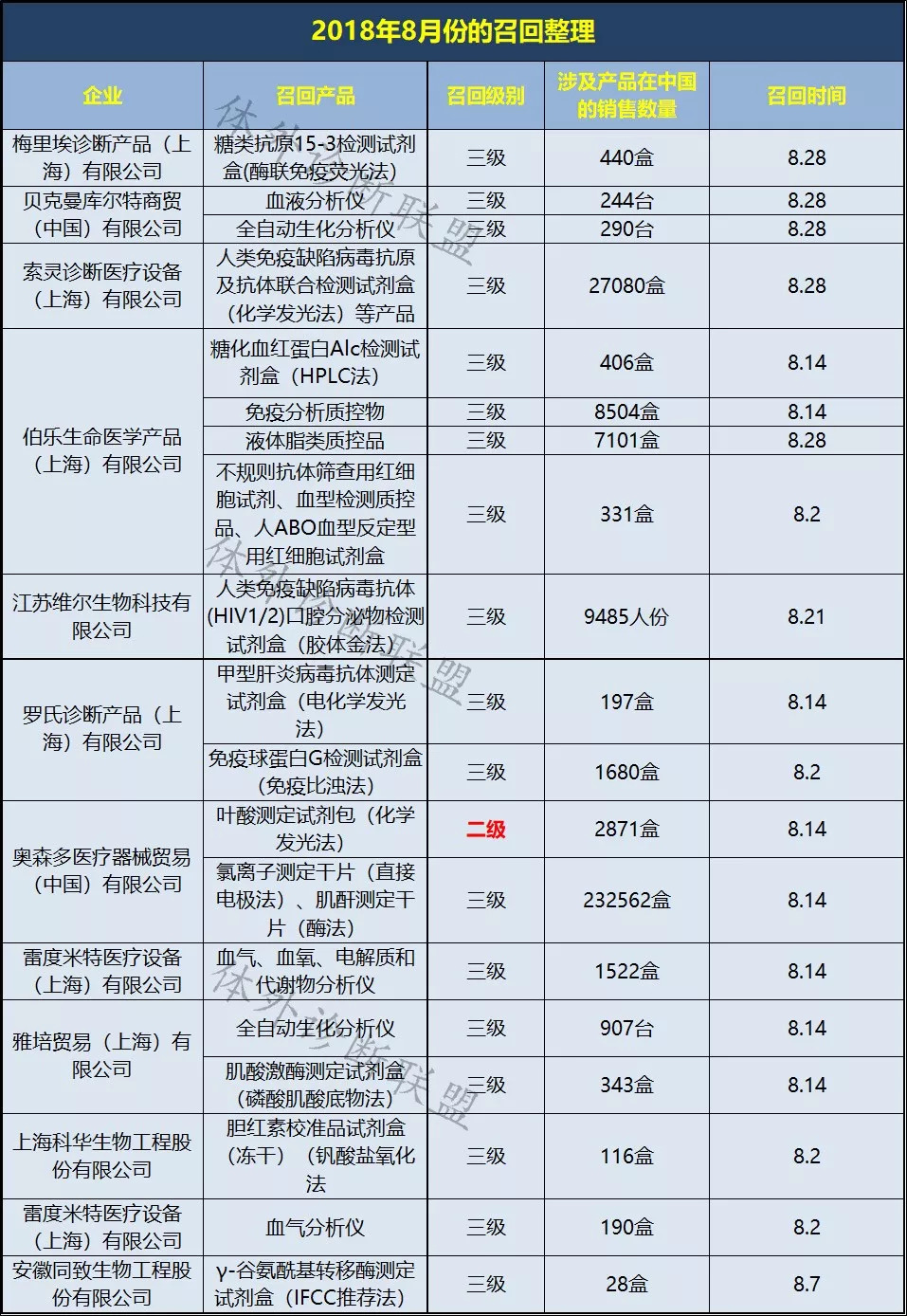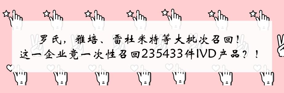 国产数量在增加! 召回意识在提高! 又到月底了,又有一大批医疗器械被召回!其中含不少IVD设备和试剂,先给大家来个预告:(想了解详情的可直接滑到文末查看具体召回文件) 8月28日一共召回35155件IVD产品,涉及企业包括梅里埃,贝克曼,索灵诊断和伯乐生命。其中索灵诊断一次性召回27080盒试剂盒! 回顾八月份,一共有12个企业的294297件IVD产品进行了主动召回,奥森多医疗器械贸易有限公司于8月14日出现了一个二级召回,并在同一天出现了一次性召回232562个试剂盒,单次召回数量最多! 在过去的几年中,被公布出来的医疗器械召回信息中,涉及的绝大部分是外资企业,但自去年开始,涉及本土医疗器械企业的召回信息开始不断出现,并且有增加趋势: 相比较过去的几个月份,七月份、五月份、六月份、四月份和一月份分别出现一个本土企业的IVD产品被主动召回。八月份国内IVD企业主动召回的有上海科华,江苏维尔以及安徽同致生物三个企业。 7月20日上海食药监局发布的该市医疗器械企业召回报告中恰恰也预示了这一点:国产召回数量在增加! 所以小Q整理八月份的召回时看到了这三个国产IVD企业感到甚是欣慰呢! 召回是一个企业负责任的态度,企业主动把风险降到最低,我们应该对这些企业提出表扬! 点击以下图片可查看之前的召回文章: 以下是昨日(8月28日)的具体召回文件: 梅里埃诊断产品(上海)有限公司对糖类抗原15-3检测试剂盒(酶联免疫荧光法)主动召回 梅里埃诊断产品(上海)有限公司报告,涉及产品的两个批次可能存在校准品S1信号超出范围下限和/或因校准品S1信号随时间持续下降而导至对照品C1超出范围上限的问题,该问题可导至无效定标或重新校准时质控不合格。梅里埃诊断产品(上海)有限公司对糖类抗原15-3检测试剂盒(酶联免疫荧光法)(注册证号:国械注进20173406916)主动召回。 召回级别为三级。涉及产品在中国的销售数量为:440盒。 1.贝克曼库尔特商贸(中国)有限公司对血液分析仪主动召回 贝克曼库尔特商贸(中国)有限公司报告,涉及产品在低版本的软件系统下,极少数的血小板计数结果可能会被错误地升高。贝克曼库尔特商贸(中国)有限公司对血液分析仪(注册证号:国械注进20142405955、国械注进20172401617)主动召回。 召回级别为三级。涉及产品在中国的销售数量为:244台。 2.贝克曼库尔特商贸(中国)有限公司对全自动生化分析仪主动召回 贝克曼库尔特商贸(中国)有限公司报告,涉及产品特定批次的全自动生化分析仪在进行“吸光度准确度”测试时可能会结果失败。贝克曼库尔特商贸(中国)有限公司对全自动生化分析仪(注册证号:国械注进20152401623)主动召回。 召回级别为三级。涉及产品在中国的销售数量为:290台。 索灵诊断医疗设备(上海)有限公司对人类免疫缺陷病毒抗原及抗体联合检测试剂盒(化学发光法)等产品主动召回 索灵诊断医疗设备(上海)有限公司报告,生物素/链霉亲和素复合物制造的体外诊断试剂盒试验在检测样本时可能存在生物素干扰。索灵诊断医疗设备(上海)有限公司对人类免疫缺陷病毒抗原及抗体联合检测试剂盒(化学发光法)(注册证号:国械注进20173402169)、丙型肝炎病毒抗体检测试剂盒(化学发光法)(注册证号:国械注进20173401352)、乙型肝炎病毒表面抗原检测试剂盒(化学发光法)(注册证号:国械注进20163402308)、乙型肝炎病毒表面抗原测定试剂盒(化学发光免疫分析法)(注册证号:国械注进20173402173)、肾素测定试剂盒(化学发光免疫分析法)(注册证号:国械注进20172401731)主动召回。 召回级别为三级。涉及产品在中国的销售数量为:27080盒。 伯乐生命医学产品(上海)有限公司对液体脂类质控品主动召回 伯乐生命医学产品(上海)有限公司报告,涉及产品的特定批次产品的中文标签及说明书使用了代理人旧住所地址。伯乐生命医学产品(上海)有限公司对液体脂类质控品(注册证号:国械注进20142405166)主动召回。 召回级别为三级。涉及产品在中国的销售数量为:7101盒。 |