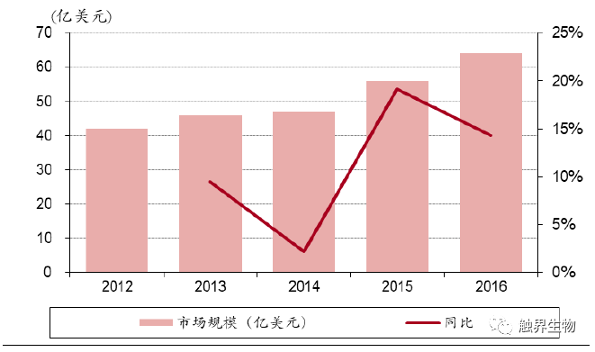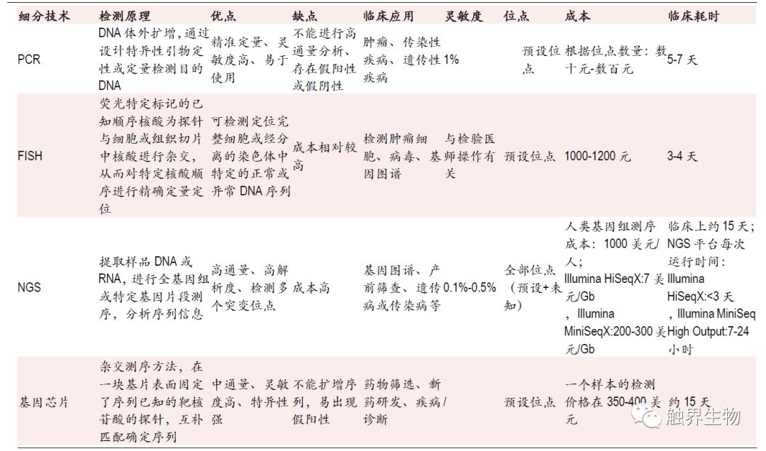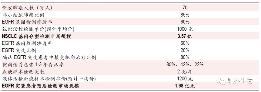 1 精准医疗新方向,分子诊断成为新蓝海 产业政策支持精准医疗及分子诊断发展,国内行业复合增速达到20%以上 国家产业政策大力支持分子诊断行业发展,并鼓励使用国产医疗器械加速进口替代进程。2015年7月,卫计委个体化医学检测技术专家委员会制订了《肿瘤个体化治疗检测技术指南(试行)》和《药物代谢酶和药物作用靶点基因检测技术指南(试行)》,要求实现肿瘤精准医疗用药基因检测标准化和规范化,这使得伴随诊断产品的获批时间延长,但是行业门槛也相应提高。2016年“精准医学研究”被国务院列为优先启动的重点专项之一。2015年发改委发布《关于实施新兴产业重大工程包的通知》提到,要重点发展基因检测等新型医疗技术,并将在3年内建设30个基因检测技术应用示范中心,快速推进基因检测临床应用以及基因检测仪器试剂的国产化。另外2018年5月1日起,进口的全部抗肿瘤药实现零关税,且原研抗肿瘤药的审批进口流程简化,并将加速纳入医保目录,这将大幅提高伴随诊断类试剂的需求量。 2016年全球分子诊断行业规模达64亿美元(占整个IVD市场的10.4%左右),近5年复合增长率约11%(IVD市场的平均增速为5%);国内分子诊断市场规模超过62亿元人民币,近5年复合增长率约23%(我国IVD市场增速为15%左右)。2016年中国人均分子诊断费用(分子诊断市场规模/人口数)约0.7美元,而欧美发达国家人均分子诊断费用普遍超过3-3.5 美元。以非小细胞肺癌(NSCLC)为例,2011版NCCN指南推荐所有NSCLC患者进行EGFR基因突变检测(目前美国普及率达到80%),这一检测比例在我国较低,以吉林省肿瘤医院的研究数据表明,我国北方地区 IIIB/IV 期 NSCLC 患者 EGFR 基因突变检测比例为 42.54%。 图表1. 全球分子诊断市场规模及增速 图表2. 我国分子诊断市场规模及增速 受遗传、环境因素、人口老龄化和人均寿命提高的影响,我国肿瘤患病人数逐年增高。根据全国肿瘤登记中心数据,中国2015年新增约429.2万癌症病例,2016年我国恶性肿瘤出院人数达300万人,同比增长16%。肿瘤病死率逐年下降,2016年我国肿瘤病死率下降至1.86%。出院人数的增加和病死率的下降意味着肿瘤发病率和存活率的提高,预示着分子诊断更为广阔的应用前景和市场空间。 分子诊断各类技术中PCR是目前应用最成熟、市场份额最大的平台 体外诊断包括生化诊断、免疫诊断、分子诊断、POCT(即时诊断)、微生物诊断及血液诊断等。其中生化诊断市场规模最大,分子诊断增速最高。我国体外诊断行业相比欧美国家起步晚,产业化发展相对滞后,然而在分子诊断行业,虽然起步较晚,但技术起点高且相对成熟,可比肩国际领先水平。 图表3. 体外诊断各细分行业概览,其中分子诊断增速最高 分子诊断主要是指编码与疾病相关的各种结构蛋白、酶、抗原抗体、免疫活性分子基因的检测。分子诊断常用技术包括聚合酶链式反应(PCR),荧光原位杂交(FISH),下一代基因测序(NGS)和基因芯片。目前PCR市场份额最多,应用最成熟;NGS是复合增速最高的技术平台。 从临床诊断应用的角度,检测的目标位点必须具有明确的临床价值,因此相对于NGS技术而言,PCR技术的简便性、稳定性和使用的广泛程度意味着在未来一段时间内PCR技术依然是核酸突变位点检测的不二选择。 图表4. 分子诊断各细分技术平台优缺点及应用 PCR平台中实时荧光定量PCR是目前最成熟和临床应用最多的技术 PCR技术是目前应用最成熟、占市场份额最大的分子诊断技术,约占分子诊断市场的67%。其中实时荧光定量PCR(RT-PCR)市场份额最大,但数字PCR的增长最快,增长率约12.2%。从全球市场来看,试剂耗材金额占比最大,检测服务增长率最高。 2 伴随诊断是肿瘤分子诊断试剂放量的必然路径 分子诊断应用于肿瘤早诊、治疗、预后全过程 随着精准医学进入肿瘤医学,分子诊断会使肿瘤患者从个性化诊疗中最大程度地获益,分子诊断可以应用于肿瘤早诊、治疗和预后全过程。在早期诊断上,病理诊断是肿瘤诊断的金标准,其中分子诊断用于病理诊断的分子分型。在个体化治疗和预后阶段,分子诊断能够提供针对特定治疗药物的治疗反应信息,有助于确定能够从某一治疗产品中获益的患者群体,从而改善治疗预后并降低医疗开支。 图表5. 分子诊断贯穿肿瘤诊疗全过程,病理准确度最高,液体活检最便捷 分子诊断多用于基因分型和伴随诊断,临床应用中疗效预测准确性比灵敏度更重要 以非小细胞肺癌为例,分子诊断多应用于肿瘤基因分型和伴随诊断。NSCLC约占全部肺癌的80%左右,绝大多数非小细胞肺癌存在驱动基因的改变。非小细胞肺癌治疗中涉及分子诊断的环节包括基因突变分子分型和耐药性检验。相关基因突变主要有EGFR突变、ALK基因融合/重排、ROS1、HER2等。临床上EGFR基因突变的检测方法包括标准测序法、扩增阻滞突变系统(ARMS)以及实时荧光PCR等,按照样本来源可以分为组织活检和液体活检。在EGFR靶向治疗上,19、21外显子突变约占EGFR突变的90%(药敏突变),一线标准治疗采用一代EGFR-TKI(埃克替尼、吉非替尼、厄洛替尼)等,少见位点有20位点的T790M突变,是EGFR敏感突变患者产生获得性耐药的主要原因之一,三代EGFR-TKI(奥西替尼)是其靶向药。 图表6. 对非小细胞肺癌患者通过基因分型选择合适的治疗药物 目前对于已知的预设位点基因突变,检测的主流技术是PCR,常见的是罗氏的Cobas平台和ARMS平台。Cobas、ARM