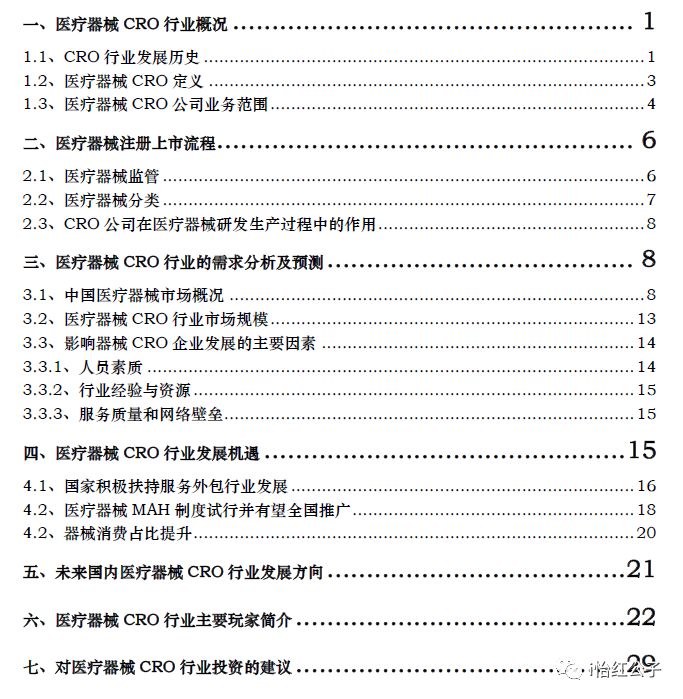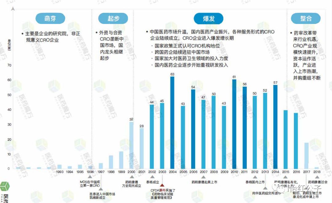 本文撰写于2018年6月份,原文首发于MedTrend会员库,较原文略有删减。感兴趣的朋友们欢迎前往医趋势会员库(https://www.tiaonali.com/tnl-member/wechat/trend/candidate/memberbak.page)下载原文,欢迎与作者就器械领域的CRO发展前景与投资标的与作者讨论交流。 原文约35页共计2万字左右,分四次推送,欢迎大家积极关注。 摘要:合同研究组织(ContractResearch Organization,CRO)是20世纪70年代后期在美国兴起的新生组织形式,其最初只是提供数据处理及统计分析的咨询服务组织。80年代,CRO模式首先在医药行业得到广泛应用。目前,在医药医疗行业的CRO公司主要集中在医药领域。在医药CRO市场持续火爆,且投资逻辑完全得到市场验证的情况下,笔者认为医疗器械CRO行业同样值得市场关注。与创新药研发路上的卖水人(医药CRO公司)类似,本质上医疗器械CRO服务也是服务外包的一种形式,依附于医疗器械行业而存在。 受国家鼓励外包产业发展、器械上市许可人制度和国内医疗器械消费水平仍有提升空间利好因素的影响,笔者认为医疗器械CRO行业市场前景将持续获得高速增长。有数据表明,国内医疗器械生产企业以及进口医疗器械贸易企业在中国上市前投入到CRO部分的服务费用大约占其市场销售额的5%左右,以2017我国医疗器械市场规模5000亿元计算,国内医疗器械CRO市场规模也有250亿元人民币,即便是扣除大公司有能力自我注册和和临床部分,行业规模也有百亿级别。 但是,与行业市场容量相对的是,目前,国内医疗器械类CRO 公司数量有数百家之多,但是行业小企业居多,营业收入和盈利能力较差,且无真正的龙头企业诞生,亟需优化整合。伴随着医疗器械行业的发展和法规的变化,CRO公司与客户的粘度变得越来越高,客户对CRO公司的需求,以及CRO公司需要给企业提供的服务,也呈现越来越多元化、越来越精细化的趋势。 全文目录如下: 引言:2018年5月8日,药明康德正式登陆A股,股价在十三个涨停板之后,公司市值冲破千亿元大关,正式成为医药资本市场新贵,也标志着药明康德正式加入国内医药上市企业千亿市值俱乐部。作为全球第九,国内最大的医药CRO企业,药明康德登陆A股也标志着创新药研发路上卖水人的第三方公司得到业内和资本市场的一致认可。在此之前,随着仿制药一致性的持续推进,泰格医药、博济医药等医药CRO公司的股价也持续走高。在医药CRO市场持续火爆,且投资逻辑完全得到市场验证的情况下,笔者认为医疗器械CRO行业同样值得市场关注。 这是因为,任何新兴行业,随着市场规模的扩大和行业内部竞争的日益加剧,都会出现专业分工的深化和产业链的整合,这种竞合趋势,往往会孕育出新兴行业的巨头,再加上国内独有的成本优势、门类齐全的产业链基础、巨大的市场前景以及高速增长的机遇,是诞生具有全球影响力的服务型巨头的最佳场所。公开资料显示,近两年我国医疗器械CRO行业的年均增长率达到了20%,医疗器械CRO行业步入了发展的黄金发展期。 一、医疗器械CRO行业概况1.1、CRO行业发展历史合同研究组织(ContractResearch Organization,CRO)是20世纪70年代后期在美国兴起的新生组织形式,其最初只是提供数据处理及统计分析的咨询服务组织。80年代,CRO模式首先在医药行业得到广泛应用。到90年代,CRO成为制药产业链中不可缺少的环节。据知名医药咨询公司Igea-hub指出,截止2017年,全球有超过1100家CRO公司。随着研发活动外包的增加、研发支出的增加、以及临床试验数目的增加,制药、生物制药和医疗器械公司对CRO的依赖性日益增强,这些有利因素正在推动全球合同研究市场以强劲的速度增长。 与国外不同,国内CRO起步较晚,1997年美迪生(MDS Pharma Service)在中国投资设立了北京美迪生研究有限公司,从事药物的临床试验业务,是中国第一家真正意义上的CRO,随后其他跨国CRO公司开始陆续在中国设立分支机构。1998年国家食品药品监督管理总局(CFDA)制定颁布了一系列药品管理法规,在中国CRO产业发展中起到了里程碑作用。2003年8月颁布的《药物临床试验质量管理规范》中的规定“申办者可以委托合同研究组织执行临床试验中的某些工作和任务”直接推动了中国CRO市场的发展。2009年,新医改启航,随着政府卫生投入的大幅增加,医药行业迎来了高速增长的黄金时期,随着企业营收的稳步向好,一些高瞻远瞩的医药企业持续加大研发投入,医药CRO行业进入了快速增长期。 图表1.中国医药CRO产业发展历程图 资料来源:医药魔方 此后,随着新药研发成本的持续上升,医药公司将非核心业务研发外包成为了降低成本的手段之一,医药CRO行业持续扩容。2015年,国务院印发了《关于改革药品医疗器械审评审批制度的意见》(国发〔2015〕44号),国家开始在注册制度和规则上优化药品医疗器械审评审批,总的来看,国家在研发端鼓励创新,先后修订了化学药品分类注册改革管理办法并推出了药品上市许可人(MAH)制度;在生产端力推仿制药一致性评价;加上在医疗机构使用上控费、限抗、限制辅助用药,千人计划、长江学者等各种“引才资智”计划吸引高端人才回国创业,资本市场医疗健康产业受到持续关注,医药CRO行业迎来发展的第二个春天。 1.2、医疗器械CRO定义医疗器械,是指直接或者间接用于人体的仪器、设备、器具、体外诊断试剂及校准物、材料以及其他类似或者相关的物品,包括所需要的计算机软件。目的是疾