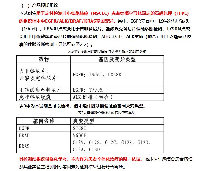 这里插一句题外话,如审评报告所言,该产品的检测结果一部分可用于伴随诊断用途,但还有一部分未经伴随诊断验证。