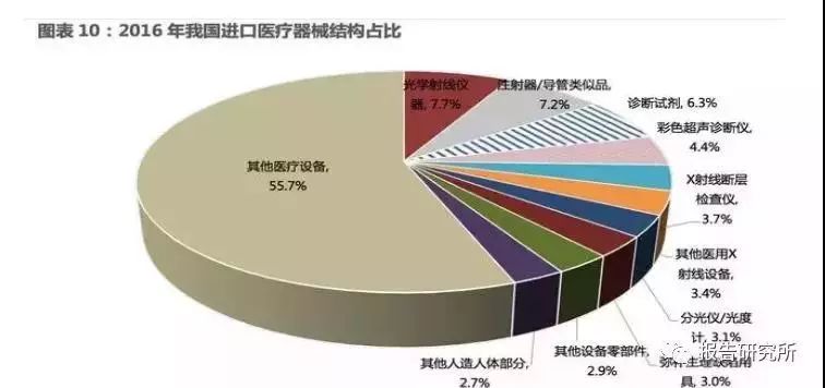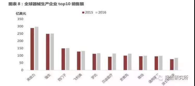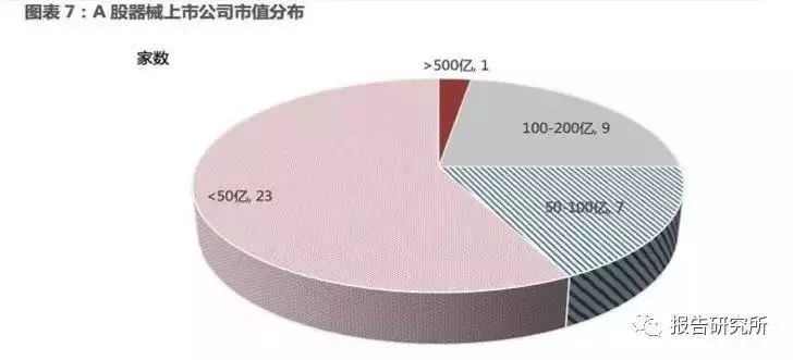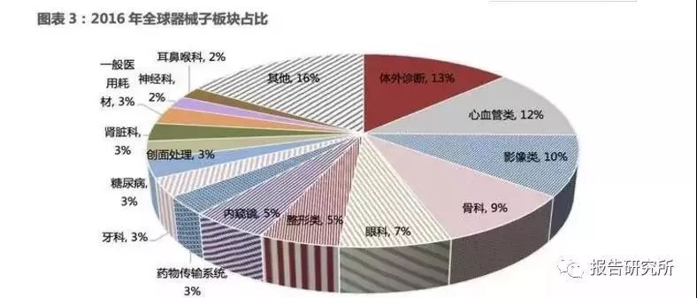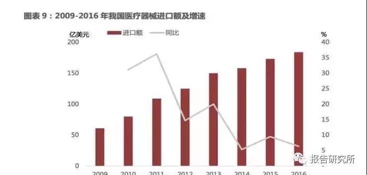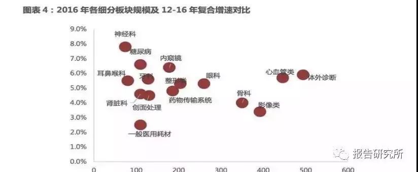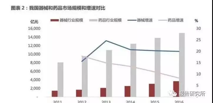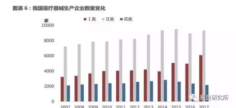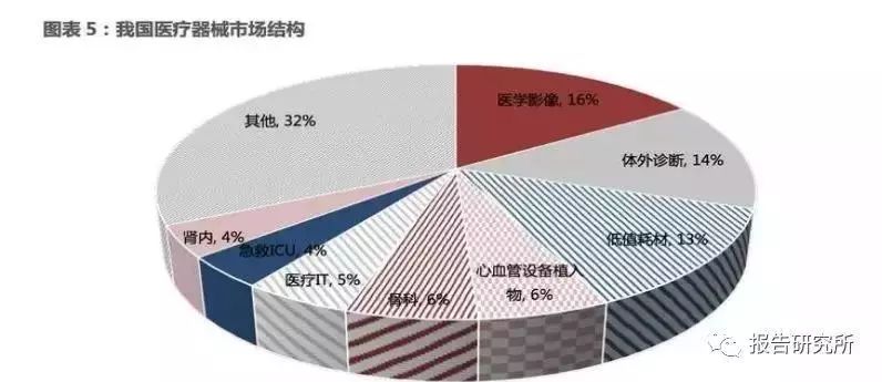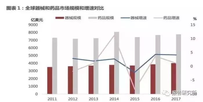 我国医疗器械行业整体保持快速增长需求驱动,全球医疗器械行业持续增长与药品整体市场相比,全球医疗器械行业显然处于不同的发展阶段:行业规模更小、增速更快、集中度尚低。 从规模和增速来看,全球器械市场行业规模仅药品市场规模的一半左右,行业整体增为药品行业增速的两倍。 2016年,全球医疗器械市场规模约4000亿,占全球医药商品市场规模的1/3。 行业增速方面,2011-2017年器械行业复合增速为2.28%,药品行业复合增速为1.00%。 可以看出近年来,器械市场的增速持续高于药品市场,且预计这种趋势还将持续,总体有望保持3%左右行业整体增长。 分区域来看,欧美日等发达国家和地区的医疗器械产业整体发展时间早,对医疗器械产品的技术水平和质量要求相对较高,市场规模庞大,以产品升级换代需求为主,增长也较为稳定。 而以中国为代表的新兴市场为全球最具潜力的医疗器械市场,市场普及需求和升级换代需求并存,整体市场增速较快。 2016年,我国医疗器械市场整体规模为3700亿元左右,占整体医药市场规模20%左右,对比国际市场,显然我国医疗器械市场还有巨大成长空间。 ▌不同细分板块存在不同发展机会 医疗器械子板块较多,按照应用领域,主要可以分成15个细分板块。 从具体领域来看,2016年全球前15大医疗器械种类销售额高达3254亿美元,合计市场规模占比为84%,其中前三类医疗器械分别是体外诊断、心血管类和影像类,2016年全球市场规模分别为494亿美元、446亿美元和392亿美元。 可以看出全球范围内,体外诊断是最大的器械子板块。细分子板块占比超过5%的有体外诊断、心血管类、影像类、骨科和眼科等板块。 从规模和增速两个维度来衡量不同板块,可以看出,从2012-2016年间,增长最快的为神经科器械和糖尿病器械板块,最大的板块体外诊断和心血管类同样保持5%以上较快增速。 与全球器械细分板块结构相比,我国医疗器械行业结构整体较为类似,但也有差别。 从我国医疗器械市场结构来看,前五大细分市场与全球类似,医学影像、体外诊断、低值耗材、心血管和骨科占据前五大市场,差别在于我国器械市场医学影像类设备占比最大,第二为体外诊断,且全球排名较低的低值耗材在我国占据行业第三位置。 总结:我国医疗器械行业预计仍将保持快速增长 2017年全球医疗器械市场规模为4000亿美元,同比增速为5%左右,略高于全球药品行业增速。 2017年我国医疗器械市场规模约4500亿元,同比增速为20%-25%,远高于全球增速,也高于我国药品市场规模10%不到的增速。 总体而言,我国医疗器械市场发展滞后于药品市场,我国器械/药物市场规模比例仅为0.2:1,远低于全球0.5:1的水平,未来空间潜力巨大。 按照20%的增速粗略估计,到2020年我国器械市场规模有望达到7700亿规模,占我国医药市场整体比重有望达到35%以上。 ▌我国医疗器械行业集中度尚有待提高 器械生产厂家众多,行业呈现“小散乱”格局 根据CFDA数据,截至2017年底,全国实有医疗器械生产企业1.6万家,其中:可生产一类产品的企业6096家,可生产二类产品的企业9340家,可生产三类产品的企业2189家。 在我国1.6万家器械生产企业里面,大部分都规模较小:目前国内医疗器械生产厂家有近万家,其中90%以上为中小型企业,行业平均收入规模在2300万元,而国内药品生产企业的平均营业收入规模在3.4亿。 此外,由于行业发展时间较晚,存在大量个体户,进一步导至行业的集中度的分散。 我国医疗器械上市公司普遍规模较小,与国际器械巨头相比差距较大。 目前我国1.6万亿器械生产企业里面,上市公司数量约50家,其中A股上市公司40家。 从目前器械上市公司的数据看,绝大多数器械公司都是2009年以后上市的,可比的化药公司多数在2009年以前就已经上市。 上市公司里面,市值超过500亿的仅乐普医疗一家,超过50亿市值的上市公司仅17家,且除了乐普医疗其余上市公司总市值均低于200亿,剩余23家器械上市公司市值均低于50亿。 从上市公司的财务数据来看,绝大多数器械公司都规模较小。2017年营业收入超过50亿元销售收入的上市公司仅迈瑞医疗、威高股份、新华医疗与迪安诊断。国内上市公司合计营业收入为830亿元,占我国器械整体市场仅18.5%,其中top10销售收入占比仅12%。 在2016年全球医疗器械3870亿美金的市场里,排名前十的企业销售额合计1453亿美元,市场份额合计37.55%,美敦力作为器械龙头,297亿美金的销售额,每年保持3%左右的稳定增长,占到全球8%左右市场份额。 可以看出,我国医疗器械公司与国际器械巨头相比,发展还处于起步阶段。无论是器械公司的规模还是行业集中度来说,我国本土企业与欧美竞争对手之间仍存在巨大的差距,国内医疗器械生产企业的集中度亟待提高。 国内高端器械市场以进口垄断为主 目前,我国医疗设备整体技术水平不高,高科技含量产品依赖进口。 医疗器械高端设备及前沿技术主要被欧美等发达国家掌握,凭借其较高的技术壁垒以及大型跨国企业的资本实力,欧美国家长期以来占据着世界高端医疗器械市场主体地位。 与此同时,随着我国医疗器械产业的发展逐渐加快,医疗器械进口规模逐渐放缓。2014-2016年,国内医疗器械进口额增速始终保持在10%以下,2016年我国医疗器械对外贸易规模达到389亿美元,其中进口额为184亿美元,同比增长6.3%,相对于2015年增速下降3.5个百分点。 从医疗器械进口结构和规