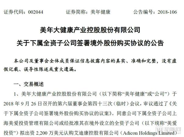 作者:李艳瑜 动脉网(微信:vcbeat)获悉,9月28日,中国体检龙头股美年大健康发布公告称,同意下属全资子公司上海美爱投资管理或经批准其在境外设立的全资子公司拟出资2,200万美元认购艾迪康控股有限公司5%的股份,并签署《股份购买协议》。艾迪康的整体估值为4.4亿美元,约合人民币30.3亿。