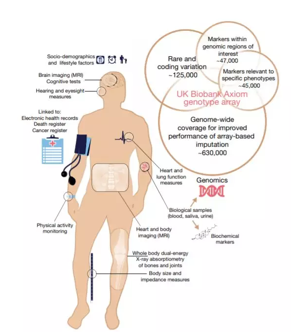 生物银行的建立过程(图片来源:参考资料[1]) 这样的例子在全球屡见不鲜,日本、加拿大、芬兰、冰岛都曾开启过类似的项目。但在其中,英国的“生物银行”规模最大。在2010年,它就收集到了50多万名个体的信息。这些大数据也给科学家们提供了宝贵的资源,找到了关于疾病的更多洞见。 今天的《自然》论文说了些啥? 最新一期的《自然》杂志上,一共刊登了4篇有关英国生物银行的文章,其重要程度可见一斑。其中有两篇文章是研究论文,另两篇文章则是《自然》的新闻报道与编辑评论。 第一篇研究论文讲述的是“生物银行”的构建流程。研究人员们在2006到2010年期间,收集了50万人的尿液、唾液、以及血液等样本,以及家族病史、生活习惯等信息。这一前所未有的高质量数据库,让全球数千名科学家得以开展研究,更深入地理解人类疾病。