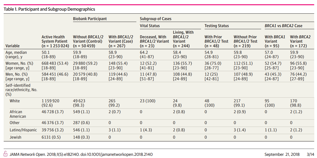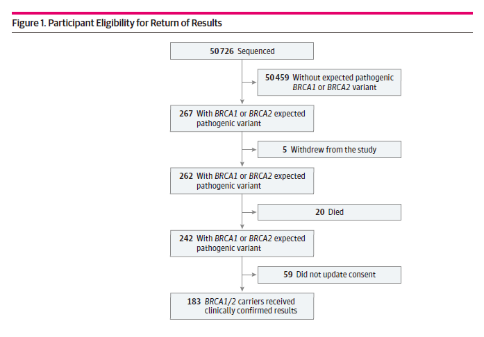 具体来说,这项研究纳入了50726名研究对象,平均年龄为60岁。在接受全外显子组测序筛查的人群中,有267人(148例为女性,119例为男性)存在BRCA风险变异,但只有18%的人在得知该研究结果之前就知道自己具有这种癌症风险因子。