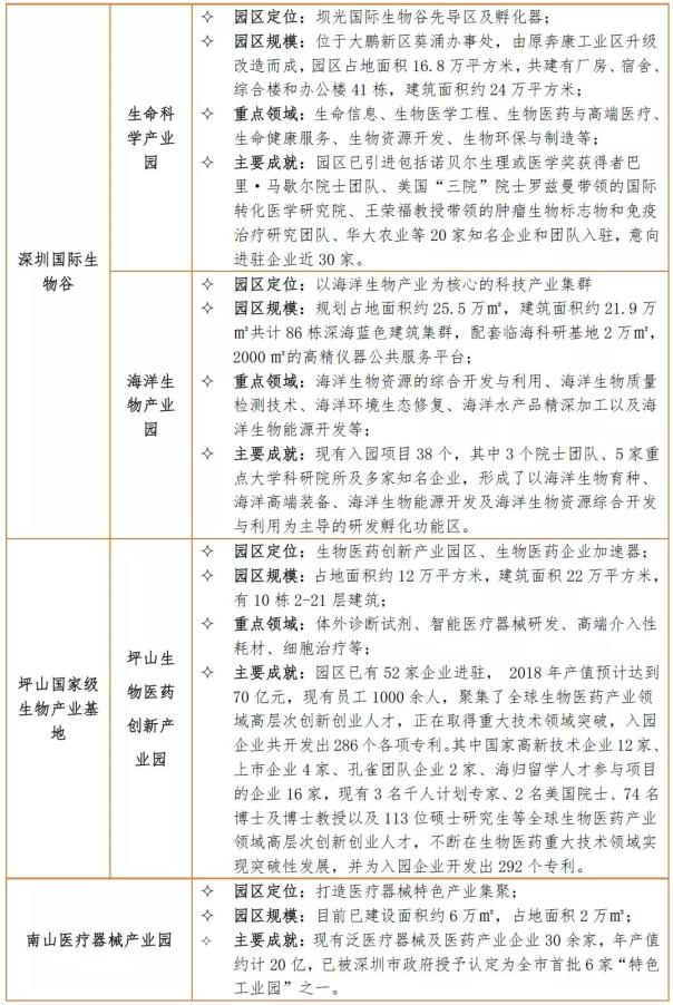 图1 2009-2017年深圳市生物产业工业增加值 资源来源:火石创造根据公开资源整理 二、空间链:形成了坪山国家生物产业基地、国际生物谷两大生物医药产业集聚区 目前,深圳基本形成了以坪山国家生物产业基地、国际生物谷两大生物医药产业集聚区为主导的产业空间格局。 1.坪山生物产业基地 坪山生物产业基地是全国首批、深圳唯一的国家级生物产业基地。基地规划了“一核”、“一廊”、“四分区”的空间结构:“一核”是生物产业创新综合体;“一廊”是沿荣田河打造的生态景观和生活配套所形成综合服务走廊;“四分区”是生物医疗器械区、生物医药产业区、生物服务区、生物产业综合发展区。经过多年发展,基地已经吸引了120余家生物医药企业和产业化平台项目入驻,代表性企业有赛诺菲巴斯德、国药致君、海普瑞、康哲药业等。 2.国际生物谷 国际生物谷于2013年由深圳市政府主导建设,是深圳市继前海之后的又一个重要增长极。深圳国际生物谷地域范围覆盖东部沿海大鹏、盐田及坪山地区,以地处大鹏半岛东北端的坝光片区为核心启动区。以坝光为核心,形成三个圈层: 核心功能圈层,以坝光为主导、与葵涌、鹏城形成三极互动的核心圈层。 融合功能圈层,与坪山、盐田等区域生物科技产业发展相融合,构建集总部、研发、生产、信息、服务于一体的生物科技产业链,形成深圳东部区域生物科技产业的融合共生发展。 协作功能圈层,拓展延伸生物科技产业链,搭建全市生物科技产业互动平台,形成全市生物科技产业的大协同发展。 国际生物谷围绕生命信息、生物医学工程、生物医药与高端医疗、生命健康服务、生物资源开发、生物环保与制造等重点发展产业领域,规划构建“一库一院两园多平台”的产城融合格局,重点发展国家基因库、中国农科院深圳生物育种创新研究院、生命科学产业园和海洋生物产业园等空间载体。 目前,国际生物谷已引进多个国际知名团队,包括“DNA之父”詹姆斯·沃森正在推进建设的“沃森生命科技中心”、巴里·马歇尔建设的幽门罗旋杆菌检测及精准医疗中心、美国三院院士伯纳德·罗兹曼的罗兹玛转化医学研究院,生物谷配套园区已引进生物企业52家、科研机构11家,年产值逾8亿元人民币。 表1 深圳市主要生物医药产业发展载体概况