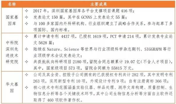 图2 深圳市生物医药产业重点企业分布情况 在基因检测领域,国家基因库落地深圳,作为我国唯一一个国家筹建的基因库,国家基因库是目前世界最大的基因库,未来将为深圳市基因检测的发展提供强大平台支撑。深圳市拥有基因检测领域龙头企业华大基因、基因治疗领域创新研发型企业赛百诺等一批优势企业。其中,华大基因依托先进的技术平台、丰富的临床经验以及庞大的基因数据库等多项核心优势,已发展成为全球领先的基因测序企业。 在医疗器械领域,深圳集聚了医疗器械生产企业700多家,总产值超过400亿元,占我国医疗器械市场总规模约8%左右。培养了迈瑞医疗、理邦、先健、开立、稳健、新产业等一批优秀企业,其中产值达亿元以上企业40多家。其中,迈瑞医疗已发展成为中国最大、全球领先的医疗器械及解决方案供应商,产品覆盖生命信息与支持、体外诊断、医学影像三大主要领域。 在医药领域,深圳市培育了国药一致、海王集团、华润三九、健康元、泰康等国内知名企业。另外,深圳吸引了赛诺菲巴斯德和葛兰素史克两大国际疫苗巨头落户,极大地增强了深圳在疫苗领域的优势。 四、创新链:各类创新主体活跃,自主创新能力显著提升 目前,深圳市生物医药领域已建成各类创新载体319家,其中国家级有21家。在基础研究领域,深圳市积极引入高技术创新人才,引进生物生命健康领域孔雀团队38个、“千人”专家32名、高层次医学团队73个;吸引了北京大学、清华大学、哈尔滨工业大学等知名学府在深圳建立校区;并通过高校或其他的平台频频牵手诺贝尔奖得主,建立诺贝尔奖获得者领衔的实验室,如已建成的劳特伯生物医学成像研究中心、兰迪·谢克曼国际联合医学实验室等知名实验室。 依托各类创新主体,深圳市生物医药领域创新能力不断提升。据火石数据库资料显示,截止到2018年8月底,深圳市生物医药领域授权专利、商标、专著数量总和达到59714个,仅次于北京,排名全国第二。 表2 深圳市重点创新主体的创新成果