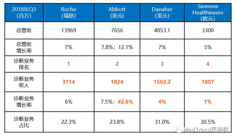 EDTREND 医趋势说 截至今日,随着丹纳赫2018年Q3财报的出炉,IVD Top4在2018年Q3财报全部公布。 2018年Q3, 诊断业务罗氏第一,雅培第二,丹纳赫第三,西门子医疗第四。 相比2017年巨头们对于IVD第二的你争我夺,目前诊断四巨头的营收差距开始拉开。 罗氏:行业第一,且仍保持着较高的业务增速,诊断营收是排名第二的1.7倍。 雅培:收购Alere让雅培仍保持着高达42.6%的增速,预计Alere整年贡献营收将超过20亿美元,让雅培牢牢占据IVD第二。但截至9月底,距离罗氏诊断的营收差额为38亿美元。 丹纳赫:诊断业务增速放缓,上半年11%的增长到了Q3,仅保持在4%。或许需要一场新并购来拉动? 西门子医疗:西门子医疗的诊断业务在排除汇率影响后,Q3增长1%。 ▲IVD Top4 企业2018年Q3数据总览 ▲IVD Top4 企业2018年前9月数据总览