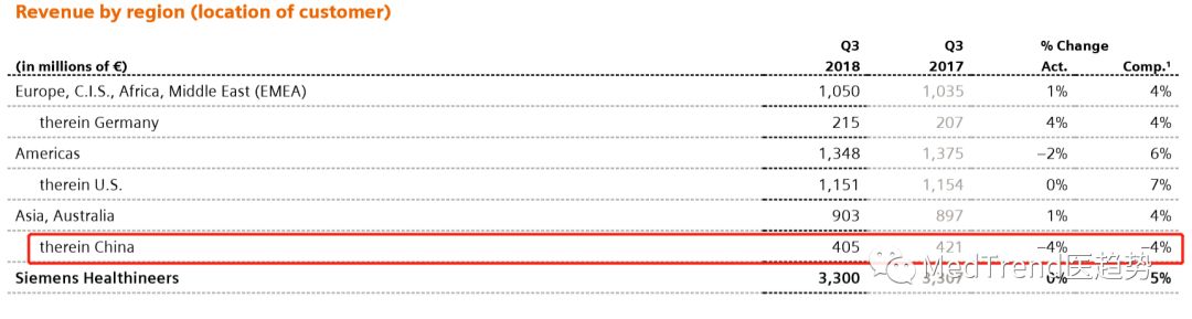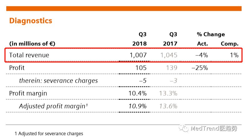 区域营收 ▲丹纳赫2018年Q3区域营收 北美:丹纳赫诊断业务第一大市场,贡献5.740亿美元营收,占诊断业务的38.2%; 西欧:营收2.623亿美元,占比17.5%; 其他发展市场:营收0.918亿美元,占比6.1%; 高增长市场(东欧、中东、非洲、拉丁美洲、亚洲,不含日本):营收5.744亿美元,占比38.2%。中国市场持续走强。 未来发展 丹纳赫财报中显示,“公司的增长战略考虑了未来的并购。” 西门子医疗2018年Q3财年区间为2018年4月1日至2018年6月30日。 整体营收 ▲西门子医疗2018Q3营收数据 西门子医疗在 2018年Q3营收33.00亿欧元,排除外汇影响,同比+5%,增长主要由影像业务(+8%)驱动。 诊断业务营收 ▲西门子医疗2018年Q3诊断业务营收数据 2018年Q3,西门子医疗诊断业务持续低迷,营收10.07亿欧元,同比+1%。