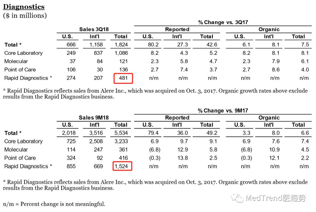 整体营收 罗氏集团2018年Q3营收139.69亿瑞郎,同比+7%。 ▲罗氏 2018年Q3财务数据 诊断业务营收分析 2018年Q3,诊断部门贡献了31.14亿瑞郎的营收,占总营收的22.3%,同比+6%。 由于罗氏未提供2018年Q3诊断业务细分领域的营收详情,因此,下列罗氏诊断细分业务营收分析针对的是2018年1月-9月。 截至9月底,罗氏诊断业务营收93.78亿瑞郎,同比+9%。 ▲罗氏诊断四大业务2018年9M数据 2018年前9个月里, 中心实验室和POC诊断事业部:营收56.25亿瑞郎,同比+7%。主要由免疫诊断(+10%)、临床化学(+5%)驱动。 糖尿病管理业务:营收14.84亿瑞郎,同比+1%。其中,血糖监测(BGM)同比+1%,侵入性检测系统(IDS)继续下滑(-4%)。 分子诊断业务:营收14.68亿瑞郎,同比+5%。其中,cobas® Liat®流感诊断增长高达250%; 人乳头状瘤病毒诊断(HPV)同比+17%;HIV诊断+6%;病毒学领域+4%。 组织诊断业务:营收8.01亿瑞郎,同比+9%。 诊断业务区域营收 ▲罗氏诊断 2018年9M区域营收数据 截至9月底,罗氏诊断在区域上主要由亚太地区(+13%)、拉丁美洲(+8%)、北美(+8%)驱动。 未来发展 未来,罗氏诊断将继续强化在集成的核心实验室(Integrated Core Lab)、综合解决方案、新学科的拓展等方面的发展。 同时,罗氏诊断也在加大对于中国市场的投入。2018年在中国新开设研发生产中心开业,到2021年将拥有400名员工,以确保亚太地区临床化学和免疫检测的持续供应。 ▲罗氏中国新工厂 整体营收 雅培2018年Q3整体营收76.56亿美元,增长+12.1%;排除并购及汇率影响,同比+7.8%。 而2018年前9个月里,雅培集团营收228.13亿美元,增长15.2%;排除并购及汇率影响,同比+7.6%。 ▲雅培2018年Q3及9M整体营收数据 诊断业务营收分析 2018年Q3,雅培全球诊断营收18.24亿美元。2017年10月收购美艾利尔所带来的协同效应加持下,诊断业务增长高达42.6%。排除收购和汇率带来的影响,同比+7.5%。 全球诊断业务营收占集团的23.8%。 ▲雅培诊断2018年Q3及9M整体营收数据 ▲雅培诊断细分业务在诊断营收中的占比 传统诊断:营收10.86亿美元,在诊断营收中占比高达60%,排除收购和外汇影响后,同比+8.1%,涨幅最大。 分子诊断:营收1.21亿美元,在诊断营收中占比7%,同比+6.1%。雅培在分子诊断市场的核心领域——传染病检测领域——的增长引领了全球销售。 Q3,分子诊断业务在美国市场止跌回升(+2.3%),但由于2018年上半年美国市场大跌10.7%,所以截至9月底,美国市场整体同比-6.8%。 床旁诊断(雅培传统POC业务):营收1.36亿美元,在诊断营收中占比7%,增长加速,同比+4.0%。增长主要由i-STAT®手持系统驱动。 美国市场与分子诊断业务境遇相同,不过,如果Q4能继续保持增长,美国市场全年业绩有望呈正增长。 快速诊断(Alere的POC业务):营收4.81亿美元,在诊断营收中占比26%。心脏代谢测试产品的销售增长尤为出色。 截至9月底,快速诊断业务营收达15.24亿美元。 诊断业务区域营收 美国市场:营收6.66亿美元,占诊断营收37%,受收购Alere的影响,增长高达80.2%;排除并购和外汇影响后,同比+6.1%。 国际市场:营收11.58亿美元,增长27.3%,排除并购和外汇影响后,同比+8.1%。 未来发展 雅培对于其Alinity家族系列诊断产品寄予厚望。在财报会议上指出,“Alinity 的全球推出,将使该业务在未来数年内保持高于市场的增速。” 距离完成收购Alere已经过去整整一年,而到2018年年底,这场大型收购有望给雅培带来超过20亿美元的营收,并让雅培牢牢占据IVD第二的位置。 整体营收 ▲丹纳赫2018年Q3数据 2018年Q3,丹纳赫营收48.53亿美元,同比+7%。生命科学业务贡献最高增长+15%、诊断+4%、环境应用+8%,但即将在2019年上半年剥离的牙科业务下滑2%。 丹纳赫Q3净利润为6.637亿美元,同比+15.0%。 诊断业务营收 丹纳赫2018年Q3诊断业务数据 2018年Q3,丹纳赫诊断业务营收15.025亿美元,占总营收的31.0%,同比+4%。受发达市场和高增长市场的强劲增长推动,分子诊断业务、临床实验室业务、急诊护理诊断业务、病理诊断业务四大细分诊断业务均出现增长。