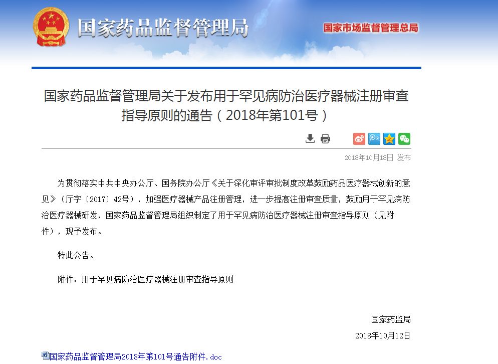2018年10月18日,国家食品药品监督管理局发布“用于罕见病防治医疗器械注册审查指导原则的通告(2018年第101号)”。 图(来自国家药监局) 以下为发布内容: 附件正文 用于罕见病防治医疗器械注册审查指导原则 为支持和鼓励罕见病防治相关医疗器械的研发,满足临床所需,根据中共中央办公厅、国务院办公厅《关于深化审评审批制度改革鼓励药品医疗器械创新的意见》(厅字〔2017〕42号)、医疗器械注册管理相关要求,制定本指导原则。本指导原则旨在规范注册申请人及审查人员对用于罕见病防治医疗器械产品的注册申报和审评审批,以患者受益为中心,科学解决用于罕见病防治医疗器械的临床评价难点,合理减免临床,以附带条件批准方式促进该类产品尽快用于临床,使罕见病患者受益。 一、适用范围 本指导原则仅适用于罕见病防治相关用途的医疗器械(含体外诊断试剂)注册及相关许可事项变更申请。本指导原则中所指罕见病为国家卫生健康委员会、科学技术部、工业和信息化部、国家药品监督管理局、国家中医药管理局联合公布的罕见病目录中所包含的疾病。 二、沟通交流 (一)申请人在注册申报前,可向相关产品技术审评部门提出沟通交流申请,以对本指导原则的适用性以及应采取的临床评价路径进行确认。针对适用于本指导原则的注册申报项目,如需要,申请人可针对重大技术问题、重大安全性问题、临床试验方案等向技术审评部门进一步提出沟通交流申请。 (二)在沟通交流申请时,应提交前期研究资料以及需沟通交流的问题,可包含: 1.罕见病的背景研究资料(如发病原因、临床症状、流行病学特征、研究进展等); 2.拟申报产品的技术原理; 3.前期安全有效性研究总结; 4.现有诊疗方法或同类产品介绍及申报产品优势; 5.产品风险分析资料; 6.需沟通交流的问题及拟采取的解决方案。 (三)技术审评部门必要时参照审评机构与注册申请人会议沟通制度等相关程序召开专家咨询会,对申请人提出的技术问题进行讨论。 (四)申请人与技术审评部门的沟通交流应有相应记录,沟通交流内容应经双方书面确认。申请人在递交注册申报资料时,应将该产品前期沟通交流记录及相关问题的解决情况进行说明,并作为注册资料申报。 三、临床前研究 (一)针对申报产品所防治的罕见病提供详细的研究背景资料,包括疾病的发病原因、临床症状、流行病学特征及该罕见病相关诊断及有效的治疗方法,明确现有方法临床应用的优缺点。该研究资料可以是申请人的科学研究结果或相关文献资料的总结。 (二)充分阐述申报产品的作用机理,明确申报产品使用时潜在的风险,并进行充分的临床前评估,产品临床前研究应能够确认产品风险在可接受范围内。 (三)提供申报产品详细的研究资料,在产品性能研究过程中建议采用模拟试验,以验证产品在模拟条件下使用的性能,同时论证模拟参数的合理性。如有必要应开展相应的细胞试验及动物试验。产品研究资料应能够证明产品的可能有效性。 (四)提供申报产品与现有的诊断及治疗方法(如有)和已上市同类产品(如有)充分的比较研究资料,并明确申报产品优势与患者受益情况。 四、免于临床试验基本原则 (一)针对用于罕见病治疗的医疗器械,其临床前经过充分的研究或有其他证据能够确定患者使用该器械受益显著大于风险的,企业在与技术审评部门进行沟通的前提下,根据技术审评部门的意见,可免于进行临床试验。 (二)针对已有同类产品上市的医疗器械(不含体外诊断试剂),可采用同品种比对的方式对其临床应用的安全有效进行评价;针对免于进行临床试验的体外诊断试剂产品,可采用同品种比对方式对其临床样本检测性能进行确认。上述评价过程所选择的同品种产品的安全有效性已得到充分验证。 (三)针对境外已上市的用于罕见病防治的医疗器械,其境外临床试验数据如满足《接受医疗器械境外临床试验数据技术指导原则》,可在注册时作为临床试验资料申报,如技术审评过程中审评部门认为产品上市前无需再补充境内临床试验的,可免于临床试验。 五、临床试验基本原则 (一)临床试验范围 用于罕见病防治的医疗器械,如其临床前研究不能证明该产品临床应用患者受益显著大于风险,应进行临床试验。 临床试验应重点关注受试者受益情况,同时,对产品临床应用安全性进行评估,所需罕见病病例数量可酌情减少。 用于罕见病诊断的医疗器械其适用人群除罕见病患者还包括疑似罕见病患者、正常人等人群,应考虑此部分人群的风险受益,并进行充分的临床验证。 (二)临床试验机构 申请人应根据疾病流行病学特征、发病原因、发病年龄及相关诊疗手段等选择多家医疗器械临床试验机构进行临床试验。所选临床试验机构应在该疾病诊断或治疗方面具有明显优势。 (三)临床试验要求 临床试验应依据产品特性设置临床应用安全有效性评价要求,此外还应关注试验用医疗器械的患者可接受度、对患者可能造成的危害及不同医疗机构之间使用差异等。 1.用于治疗罕见病的医疗器械 针对目前尚无有效治疗手段的罕见病,申报产品在临床试验中应明确治疗效果的判定标准及制定依据;针对目前已有有效治疗手段的罕见病,申报产品在临床试验过程中可采用与已有治疗手段的对比研究,已有治疗手段的有效性和患者风险受益比可