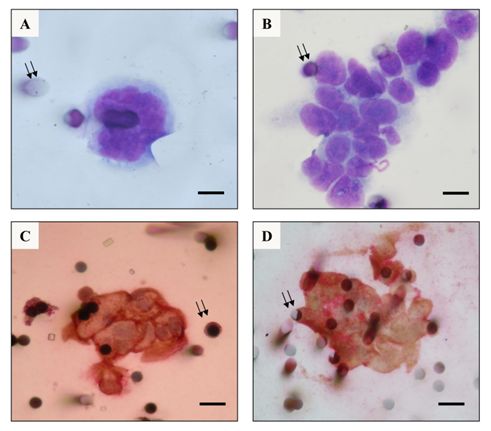 (A)和(B)为患者1的血液样本采用ISET技术富集CTCs后,通过MGG染色鉴定。(A)具有恶性细胞形态学特征的单个CTC(双箭头:过滤器的孔隙)。(B) 由20个具有恶性细胞形态特征的CTC聚集成团的细胞团(CTM)(双箭头:含有淋巴细胞的孔隙)。