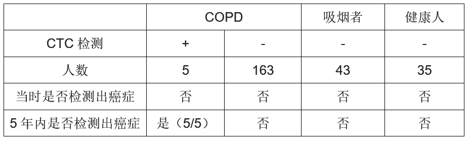 在临床上,CTC检测凭借更超前,更安全,灵敏度高,特异性好等优势在早筛取得越来越广的应用。以法国Pasteur医院(Department of Pulmonary Medicine)为领导开展了一项针对肺癌高危人群的临床研究,慢性非阻塞性肺病(COPD)是一种具有气流阻塞特征的慢性病,包括支气管炎和(或)肺气肿,该病与有害气体及有害颗粒的异常炎症反应有关,致残率和病死率很高,全球40岁以上发病率已高达9%~10%。近数十年来阻塞性肺气肿的发病率显著增高,这是由于大气污染、吸烟和肺部慢性感染等诱发因素有关。已知COPD与肺癌密切相关。美国一项为期5年的研究表明,慢性阻塞性肺疾病(COPD)患者的肺癌发病率高达16.7/1000人。这是第一次用CTC作为标记物作为COPD患者肺癌早期筛查的标志物。该研究共招募了245名受试者,其中COPD患者168名,以及非COPD对照组77名(其中吸烟者42名、非吸烟者35名)。研究中对所有的受试者进行了基于膜过滤分离肿瘤细胞技术(Isolation by Size of Epithelial Tumor cells, ISET)的CTC检查。ISET技术依据肿瘤上皮细胞的大小,使用孔径约8微米滤膜进行CTCs的富集。富集后以形态学和特异性标志物作为鉴定标准,并对于所有试验对象每年进行胸部低剂量CT筛查。研究发现,在168名COPD患者中有3%(5/168)检测出CTC,当时这5名患者未检出任何病灶及临床表现,但在随后1-4年(平均3.2年)的CT筛查中均检测出肺部结节,并马上通过手术摘除1.4~2.0cm大小的肿瘤。术后12个月,肿瘤无复发且再没有检查出CTC。另一方面,在未检出CTC的COPD患者及对照组研究人群(非COPD患者的吸烟者以及非吸烟健康者中)在5年后的CT扫描中都未检查出肺部结节(详见表1和图1)。这个结果说明,CTC检查可能在发现早期癌症上发挥了“看门人”的作用。
