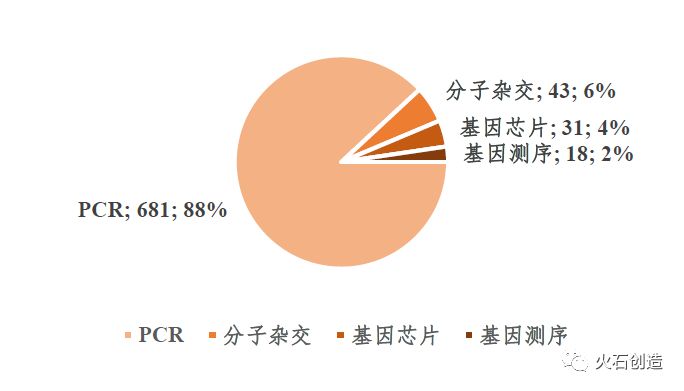 其中,基于PCR技术产品681个,基于杂交技术产品43个,基于基因芯片技术产品31个,基于基因测序技术产品18个。从各技术类别来看, 由于PCR技术壁垒相对较低,国产化程度高,国内企业布局相对较早。因此,基于PCR技术的检测试剂盒占据总产品的80%以上。并且随着ddPCR技术的不断成熟,预测PCR检测试剂盒的应用将会更为广泛。