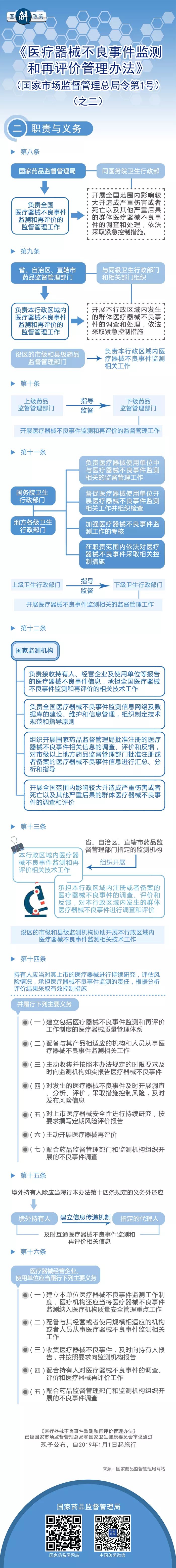 日前,国家市场监督管理总局和国家卫生健康委员会联合发布《医疗器械不良事件监测和再评价管理办法》,共九章八十条,自2019年1月1日起施行。