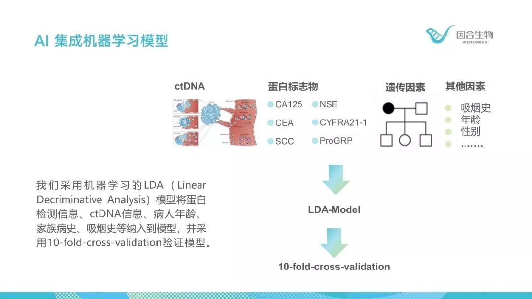 人工智能大数据分析是当下学术界和产业界所追逐的热点,而生命信息的复杂性、特殊性使其研究显著区别于其它领域,每一份样本背后都代表着一个鲜活的生命,具有无限价值。加上超深度基因分析极其昂贵的研究成本,产生巨量基因组数据,结合其它临床信息,一定会揭示疾病发生发展的重要机理。我们必须最大限度挖掘数据价值,信息维度越丰富,对于提高检测结果的可靠性和准确性越有价值。因合生物在健康人基线数据基础上,通过建立训练样本集,采用机器学习的方法,最终完成了结合ctDNA、蛋白标志物、家族史、既往史和个人史等多种因素在内的多维肺癌辅助诊断分析。