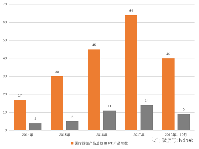 为鼓励医疗器械的研究与创新,促进医疗器械新技术的推广和应用,推动医疗器械产业高质量发展,我国于2014年3月1日起施行《创新医疗器械特别审批程序(试行)》。符合条件的医疗器械注册申请人可以向药品监管部门申请以特别审批程序进行审批。在审批程序的诸多环节中按照早期介入、专人负责、科学审批的原则,对创新医疗器械予以优先办理,从而加快其审批进程,并加强与申请人的沟通交流。此制度是“加快上市审评审批”是重要改革措施之一,审批比例呈现逐年递增的趋势。截止2018年10月30日,已有196项产品通过了特别审批程序,其中IVD产品43项,占比21.94%。