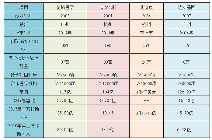 目前,我国基层医疗机构专业检验人才缺乏、检测项目数量较少、缺乏有效质量控制等,直接影响了检验质量和区域检验结果互认的实施。 以病理科为例,我国病理科执业医师(含执业助理医师)只有不到1万人,与每100张床配备1~2名病理医生的国家标准差距悬殊,且病理医生集中于三级以上医院。区县、偏远地区医院病理医生匮乏,严重影响对疾病的精准诊断。 在很多地方,独立医学实验室已探索与基层医疗机构形成多种合作模式。比如,与区域内牵头医院共建,形成的河北省邢台市威县区域检验中心、四川省资阳市雁江区区域检验中心等;在政府主导下,组建的上海松江区区域检验中心;以区域内核心医院为龙头,组建的广州从化妇幼医院检验专科医联体和广州清远精准医学中心;依托检验病理医生集团,建立覆盖全国的远程病理诊断协作网等。 此外,随着大健康、大医保观念的形成,部分地区已在探索传统送检服务如何与医保相衔接。比如,山东省青岛市形成了以“医保+医检”集中送检的模式,利用独立医学实验室的技术、规模、成本和质量等多方面优势,使基层医疗机构获得与三级医院水平接近的检验和病理服务。 提质增效降费成效初显 独立医学实验室可通过对城市医疗机构提供高端检查项目,与公立医院服务项目互为补充;与基层医疗卫生机构合作共建,提高基层服务能力,助力构建横向到边、纵向到底的检验服务体系。从服务效果上看,独立医学实验室在以下三个方面显现出优势。 有利于提升基层服务质量和效率。由于成本控制及项目定价的限制,大型三甲公立医院一般只能开展300~500种检验项目,而连锁型的大型医学检验实验室可以开展2500多个项目。通过共享优质医疗服务资源,在减少地区重复投入的同时,可使基层医疗机构拥有专业的检验人员、先进的仪器设备、严格的质控标准,有效降低采购成本及人力投入,体现集约化效益。同时,便于提高检测效率和质量,降低差错率,有利于主管部门对检测结果进行质量控制和管理。 有利于改善群众就医体验。检验中心与定点社区医疗机构签约后提供上门服务,由专业的冷链物流队伍运送样本,通过网络系统及时反馈检验结果,患者在定点社区医疗机构就能实现采样送检、收取结果,不必到大医院排队等待。通过“患者不动,标本动、信息动”的方式,逐步实现“基层检查,医院诊断”。 有利于降低医疗费用,节省医保资金。如青岛市探索的“医保+医检”服务模式,集中送检项目按照医疗服务价格的90%收费,并纳入医保结算,2013年~2017年,仅常规检查项目,医保支出就节约了近千万元。同时,引导独立检验机构进行慢病管理,促进医疗和保险双方逐步转向以成本、疗效和综合价值为取向的支付模式,有利于促进精准诊断和防治结合,使医、患、保、检四方都有所获益。从对医保的预算影响来看,以2016年为基数,假设我国2016年~2020年间,每年医保支出额以每年3%的速度匀速增长,推算独立医学检验机构每年节省花费约占医保支出的1%。 目前,国内独立医学实验室市场以迪安诊断、金域医学、艾迪康、达安基因四家龙头企业为主。四大龙头ICL实验室总数超过100家,份额占整个第三方医检市场的70%左右。 数据来源于各企业第三季度公告 *艾迪康未上市 数据来源:各公司年报、招股说明说、公司官网 四大公司中,金域医学在实验室数量,市场覆盖面,检验项目数量上均处于领先位置,但从营收和净利润来看,无论是17年还是今年1月份到9月份,金域不敌迪安诊断。艾迪康和达安基因在医学检验室数量和检验项目数量方面与金域和迪安相比仍有差距,但达安基因在分子诊断产品和服务领域具有优势。 金域医学成立于2003年,目前是国内独立医学检验领域的龙头企业。医学检验实验室达到了37家,检验业务包括为理化质谱检验、基因组检验、病理诊断、生化发光检验、免疫学检验和其他综合检验等6大方面。 迪安诊断成立于2001年,最初作为罗氏的代理商起步,2004年开始转型进入第三方医学诊断服务外包领域,并于2011年7月在行业内率先上市,实现中国独立医学实验室上市“零的突破”。医学检验实验室达到了36个(包括正在筹建的),业务模式包括:“产品+服务”整体解决方案,实验室合作共建模式,区域性平台合作模式,混合所有制模式(PPP模式),委托新建实验室 ,“3+N”多业务整合推进模式 ,疾病管理+健康管理模式 ,健康医疗社区下沉模式 。 艾迪康成立于2004年,是全国跨地区连锁经营的第三方独立医学检验机构。医学检验实验室有20家,开展业务有组织病理、细胞病理、流式细胞和细胞遗传学等多个专业业务。今年九月底,艾迪康被体检巨头美年大健康收购了5%的股份。 达安基因依托中山大学雄厚的科研平台, 是以分子诊断技术为主导的,集临床检验试剂和仪器的研发、生产、销售以及全国连锁医学独立实验室临床检验服务为一体的生物医药高科技企业。医学检验实验室有8个,从规模和盈利能力看,达安基因暂时处于劣势,但依靠公司的分子诊断产品优势,达安基因有望实现弯道超车。 独立医学实验室是整个医疗服务体系里最能集约化、降低成本、实施同质化的环节。随着医联体建设和公立医院改革的推进,将会在基层医疗卫生服务能力提升上发挥更大作用。从长远来看,独立医学实验室要以质量作为发展核心,一方面独立医疗机