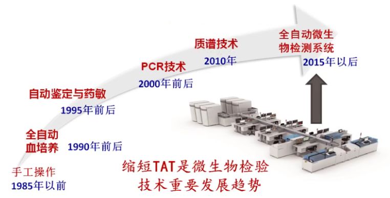 18世纪中叶以来,人类历史上先后发生了蒸汽技术革命、电力技术革命、信息技术革命三次工业革命。信息技术革命使人类的发展进入空前的繁荣时代,但同时也造成了巨大的能源、资源的消耗,付出了巨大的环境代价。进入21世纪,人类面临空前的全球生态与环境危机,由此引发第四次工业革命-----绿色工业革命,一系列生产函数的发生以自然要素投入为特征,达到向绿色自然要素投入跃迁,并普及整个社会。这场以互联网、大数据、云端化、智能化为技术核心的新一轮产业革命,将为检验医学领域带来新的机遇与挑战。比如说医联体,医联体没有智能化的支撑无法启动,我们提倡精准医疗,没有大数据的支撑也难以为继。只有通过这个革命,才能促使它们的发展。 1、实施医学实验室全程智能化质量管理; 2、智能化优化的检验流程可明显缩短检验的TAT,使患者及时得到诊断和治疗。(衡量实验室的质量标准一是准确,二是TAT,也是IVD厂家要思考的问题。最有代表性的就是微生物,过去四天才出检测结果,五天才给药敏试验,现在通过智能化18-16个小时就能出结果,为许多患者赢得了生机; 3、使用“数字成像”和“视觉识别”技术,用于细胞形态学自动识别和远程即时诊疗或远程会诊; 4、检验结果智能化大数据管理与应用,有利于国家“大健康”、“慢病管理”政策准确的制定和实施; 5、互联网+POCT构成的智慧医疗促进了老年医疗和急症医学的发展。